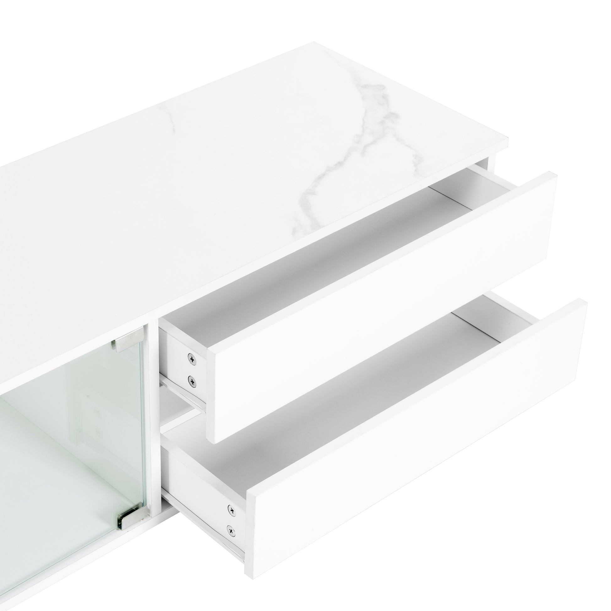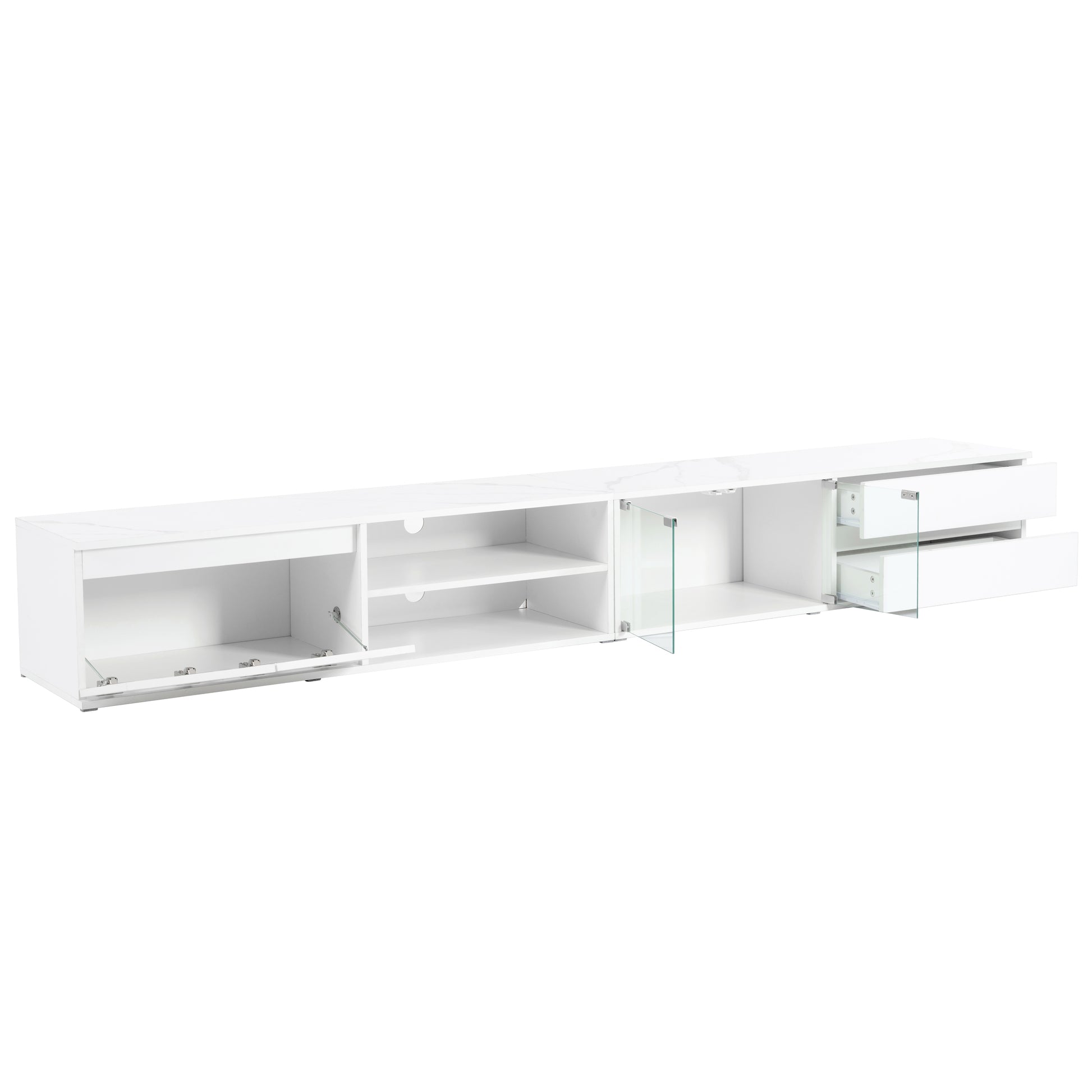 ON-TREND Modern APP Controlled LED TV Stand for TVs Up to 105'', Faux Marble Tabletop Media Console with Tempered Glass Doors, Entertainment Center with 2 Drawers & Cabinets for Living Room, White