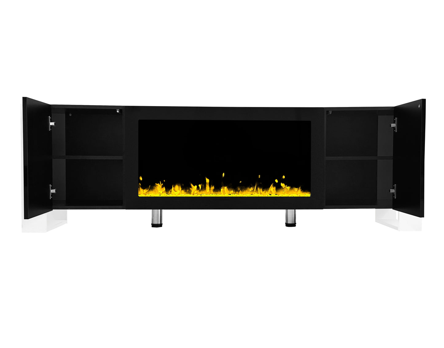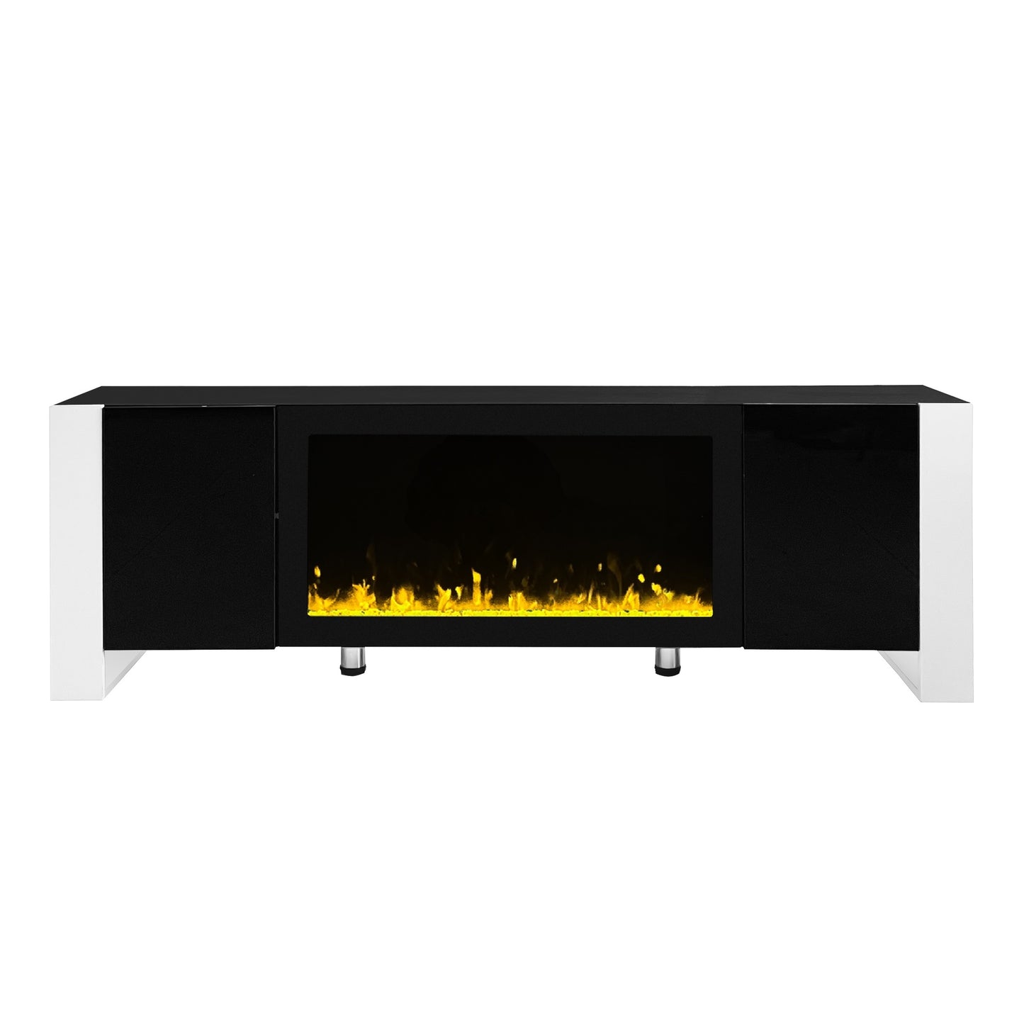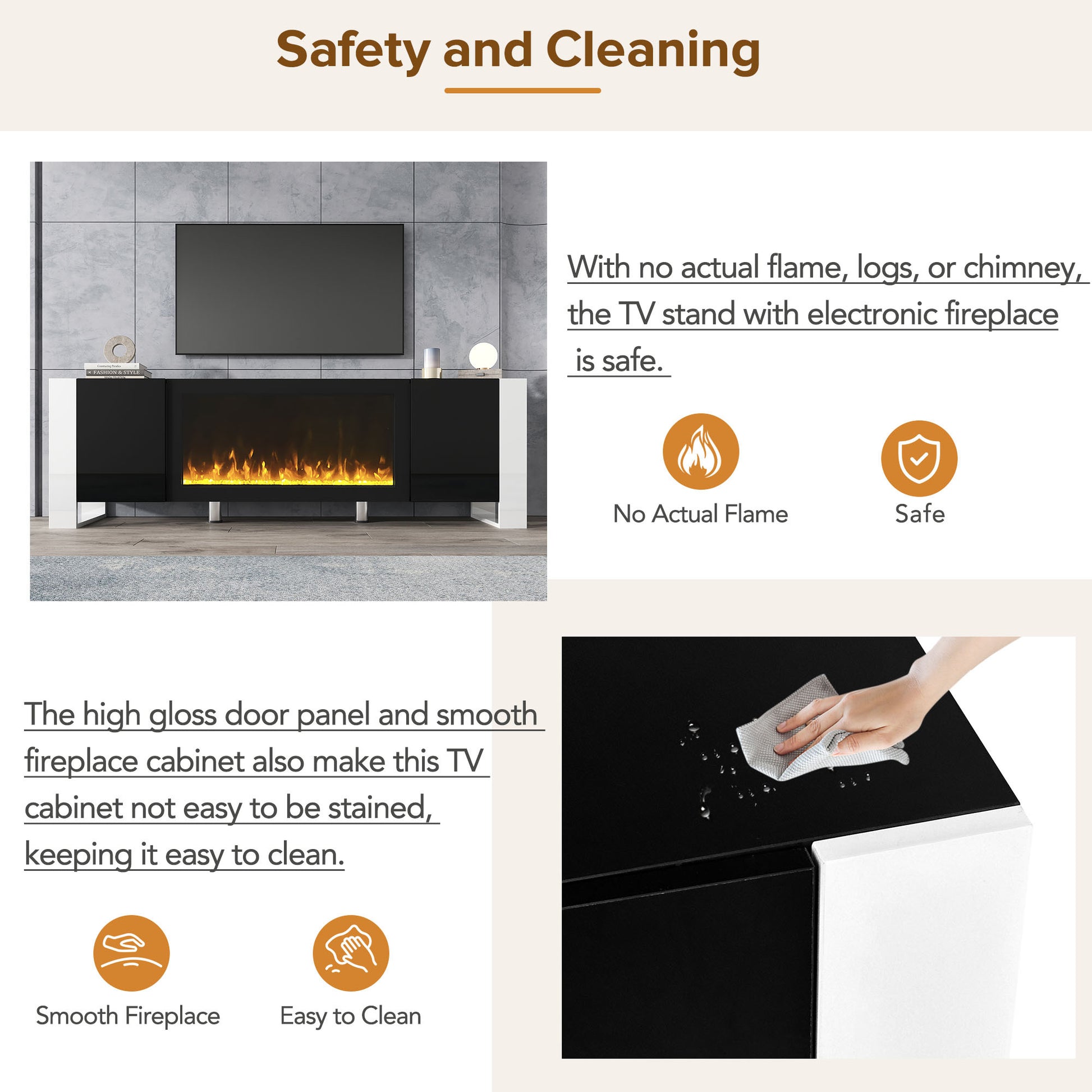With no actual flame, logs, or chimney, the TV stand with electronic fireplace is safe. The high gloss door panel and smooth fireplace cabinet also make this TV cabinet not easy to be stained, keeping it easy to clean.