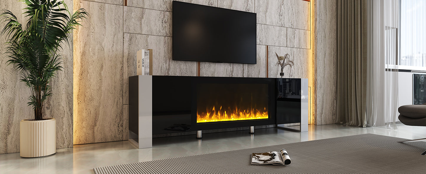 ON-TREND Modern TV Stand with 34.2' Non-heating Electric Fireplace, High Gloss Entertainment Center with 2 Cabinets, Media Console for TVs up to 78', Black
