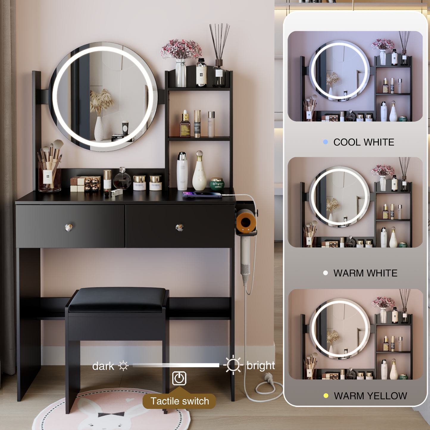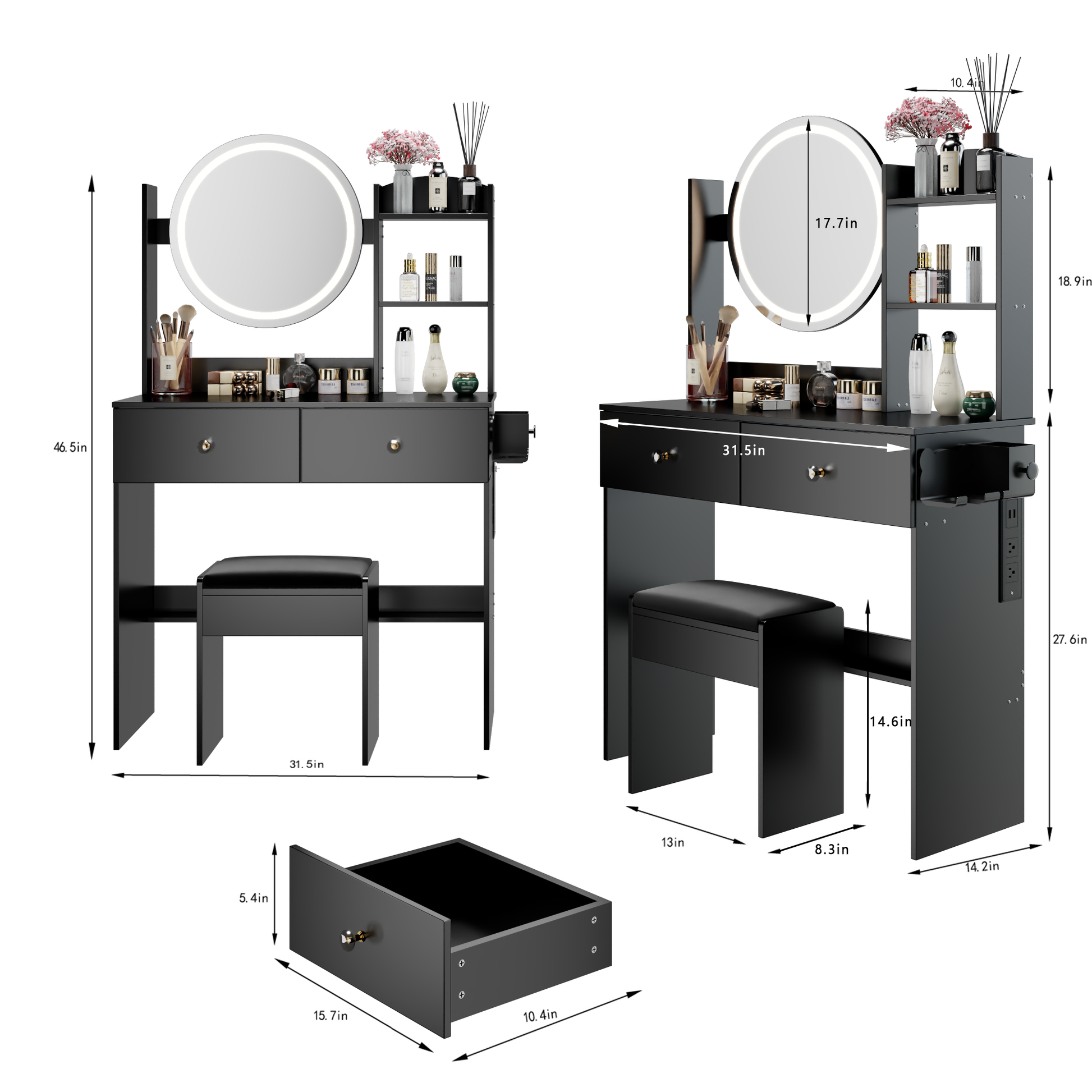 17' Round LED Mirror Vanity Table+Cushioned Stool, Equipped With 2 AC+2 USB Power Socket, Big Mirror, Touch Switch, 3 Colors, Adjustable Brightness, Large Desktop, Multi-layer High Capacity Storage