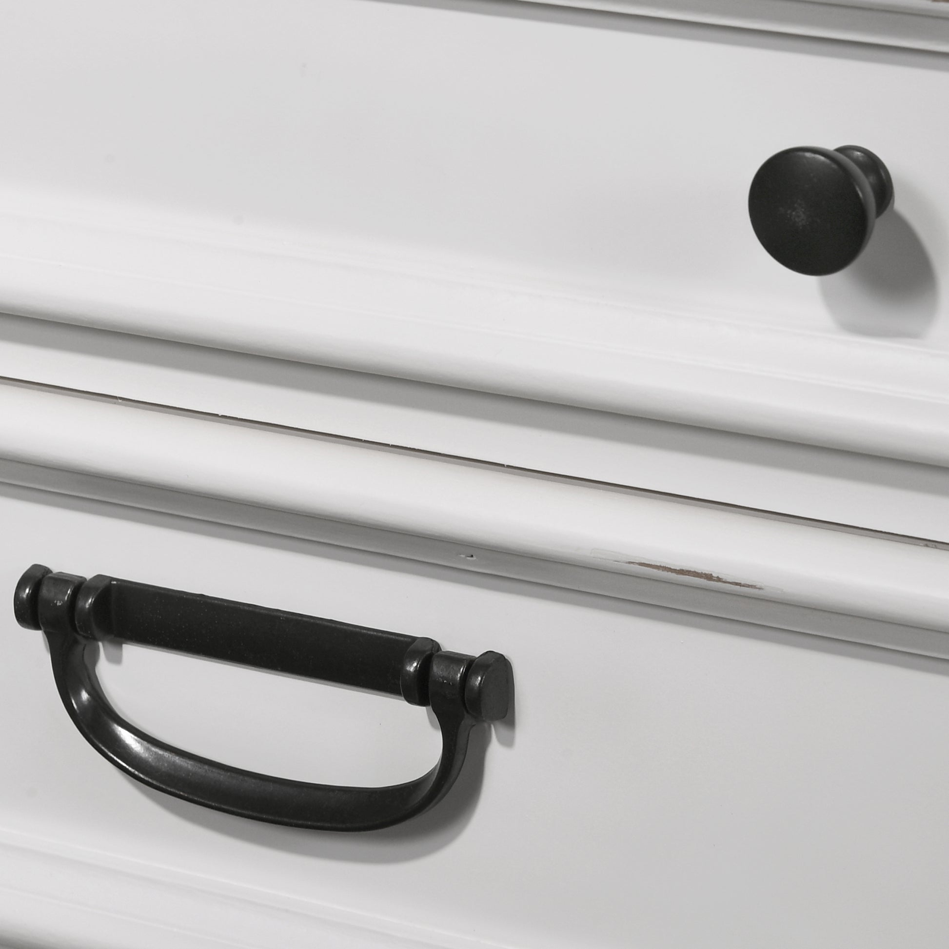 - The distressed mark, delicate carved trim, and black finished hardware bring a touch of modern farmhouse style to this piece