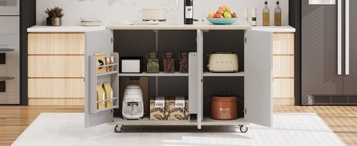 K&K 51.2'W Ash Veneer (Not Cheap Paper) Solid Wood Handwoven Kitchen Island with Drop Leaf, Coastal Kitchen Island on Wheels with Internal Storage Rack, Rolling Kitchen Cart, Champagne