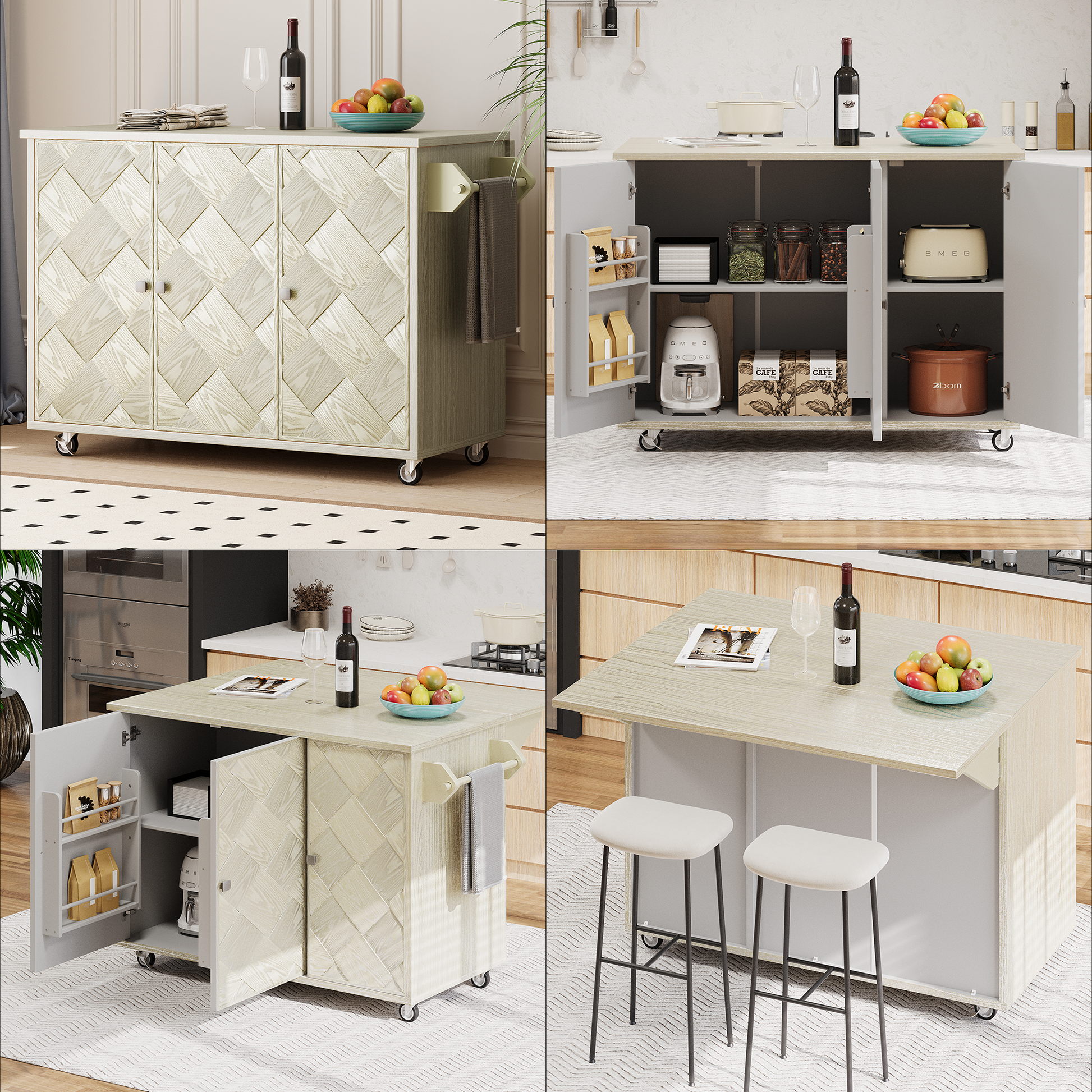 | Summary | This modern coastal style indoor kitchen island dining cart can bring class and elegance to your kitchen space while bringing a great degree of convenience to your indoor storage. It is mainly made of eco-friendly MDF material that will stand the test of time for a long time. The overall wood grain look coupled with the ASH veneer handwoven construction will give your kitchen a more upscale look. In terms of storage space, this kitchen cart has a large 46.5''-wide countertop with drop leaf design, a side towel rack, two internal storage racks and adjustable shelves, so you can freely arrange different items as needed. There are four wheels on the bottom of the product, two of which are lockable and able to move and stop freely. If you need stability, you can also replace the wheels with the included wooden feet. This kitchen island can make you no longer worry about storage in your kitchen space. |