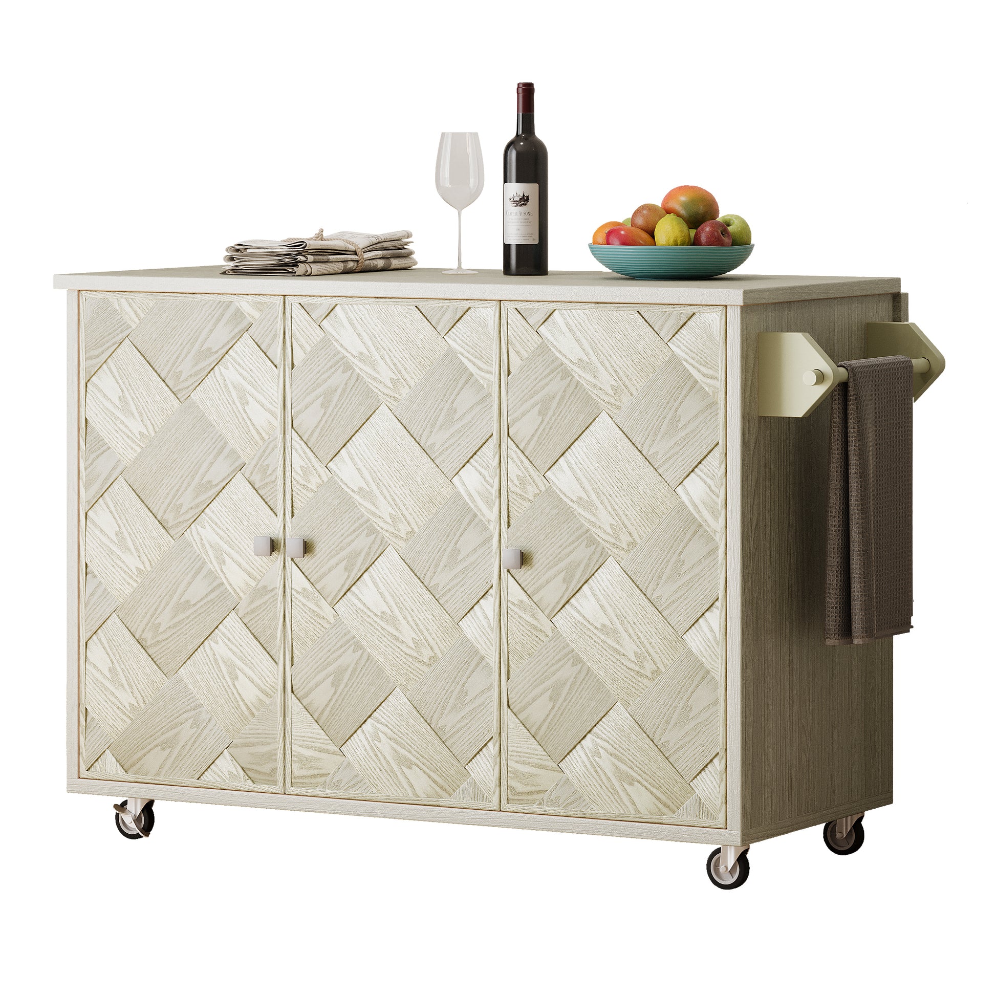 - [ASH Veneer Handwoven Doors] Our modern coastal style kitchen island retains the beauty of excellent natural aesthetic design and woven textures. The unique color appearance and wood grain texture of the ASH veneer door paired with a handwoven design. One will not be able to help but marvel at its unique take on aesthetics. The surface of the kitchen cart is painted in a very smooth and detailed finish that will stand the test of prolonged use and bring a longer lasting appeal to your kitchen.