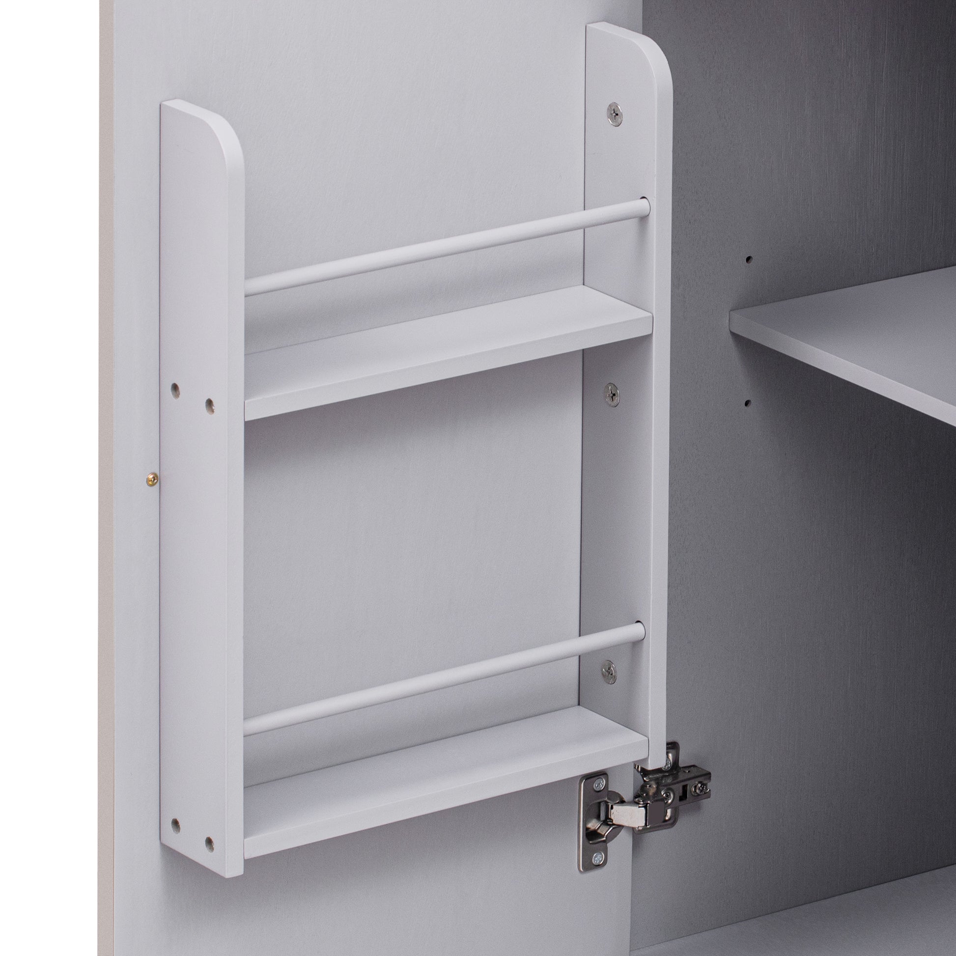 Height-adjustable shelves inside the cabinet doors provide flexibility in accommodating various kitchen items of different sizes.