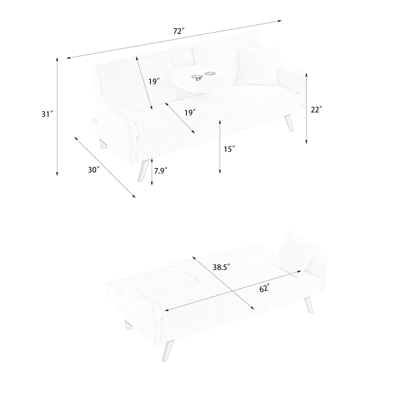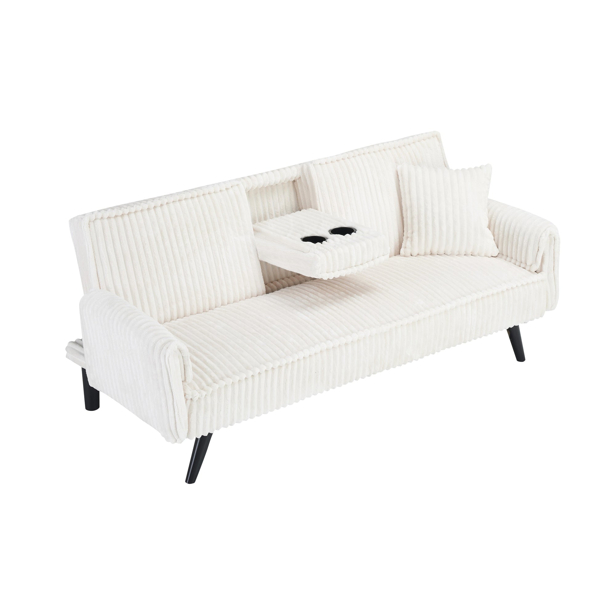 The pristine white sofa, like the first snowfall of winter, is made of corduroy fabric that gives it a unique texture. shade of white easily brightens any space and effortlessly complements various home decor styles. Ingeniously embedded in the center of the sofa back are two cup holders, are easy to operate and perfect for hosting a few friends. The backrest can be adjusted to three different angles: the first position allows you to lean back slightly stretching your spine; the second position offers a deeper recline, providing support for your lower back; and the third position transforms the sofa into a soft bed with single push, perfect for when you're tired and need to stretch out. The sofa's frame is made of selected high-quality solid wood and plywood, providing a 'skeleton' with excellent load-bearing capacity. Choosing this sofa is not just about adding a piece of furniture to your home, but also bringing in comfort,, and a quality lifestyle.