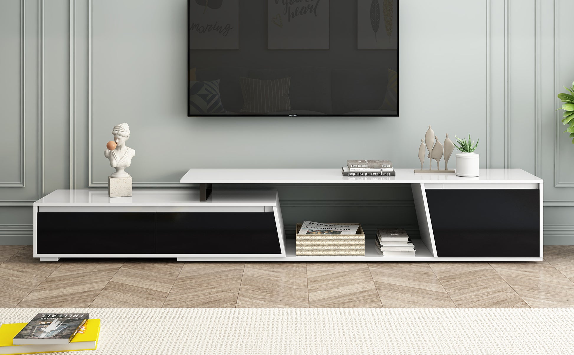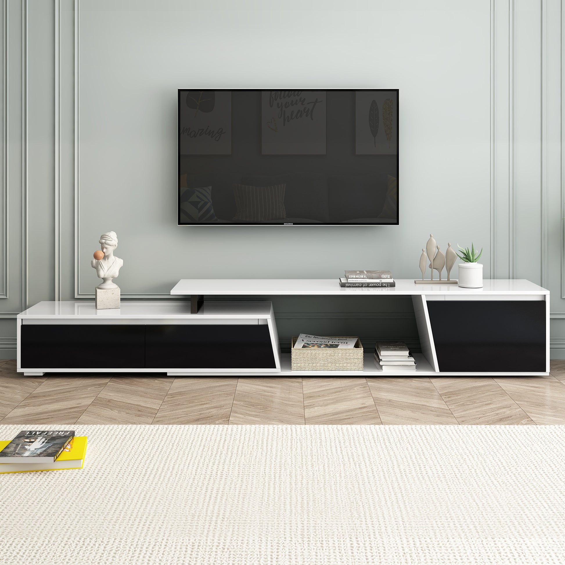 - Asymmetrical Art-Inspired Design: Drawing inspiration from asymmetrical art, this sleek and modern TV stand becomes a statement piece that adds visual interest to any living room.