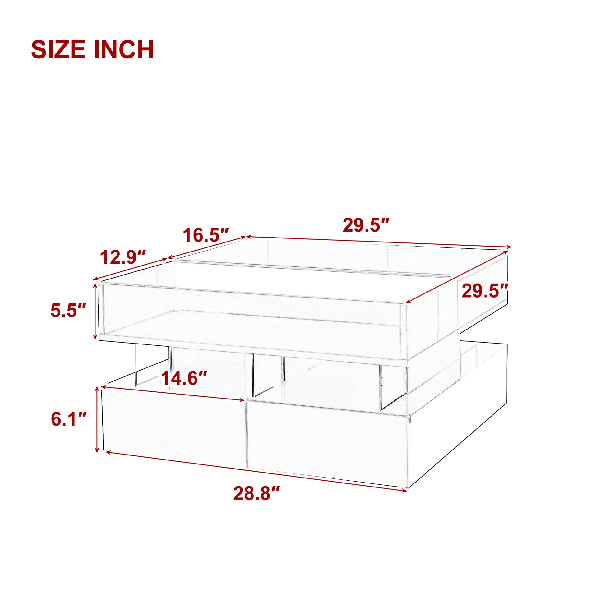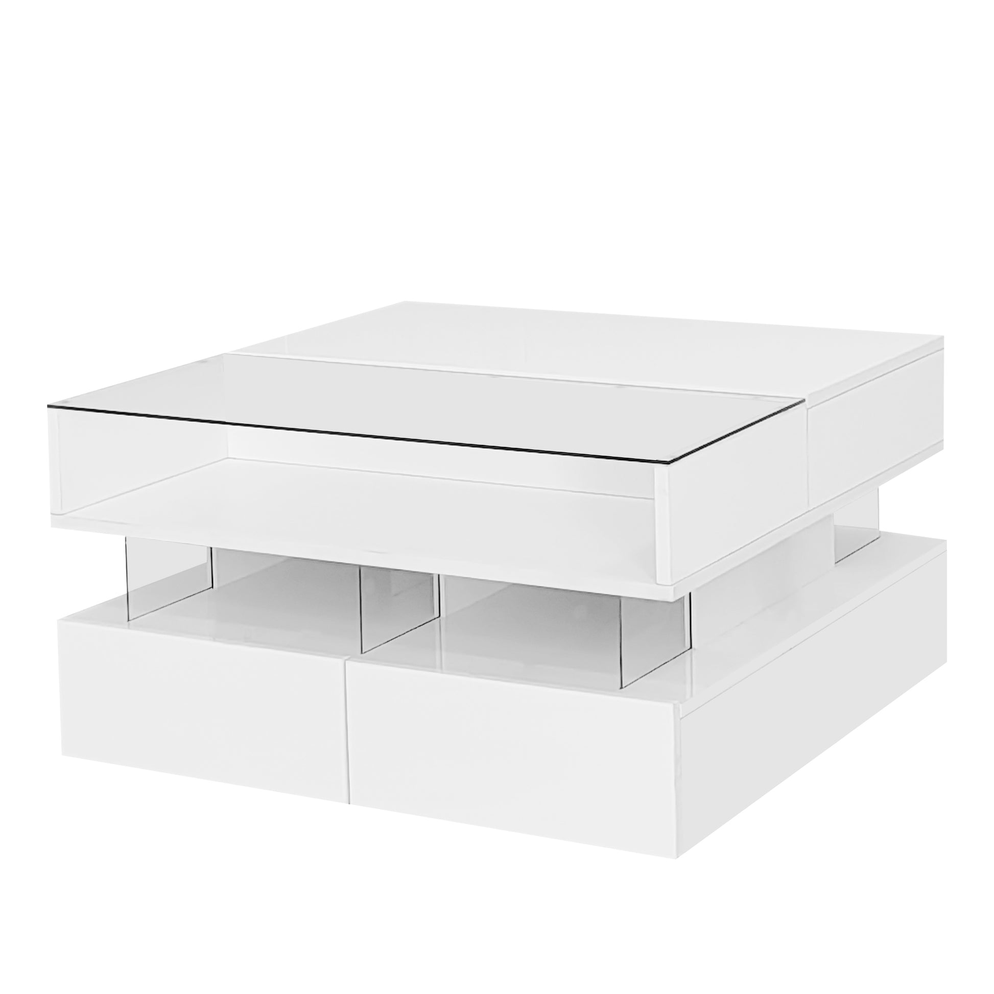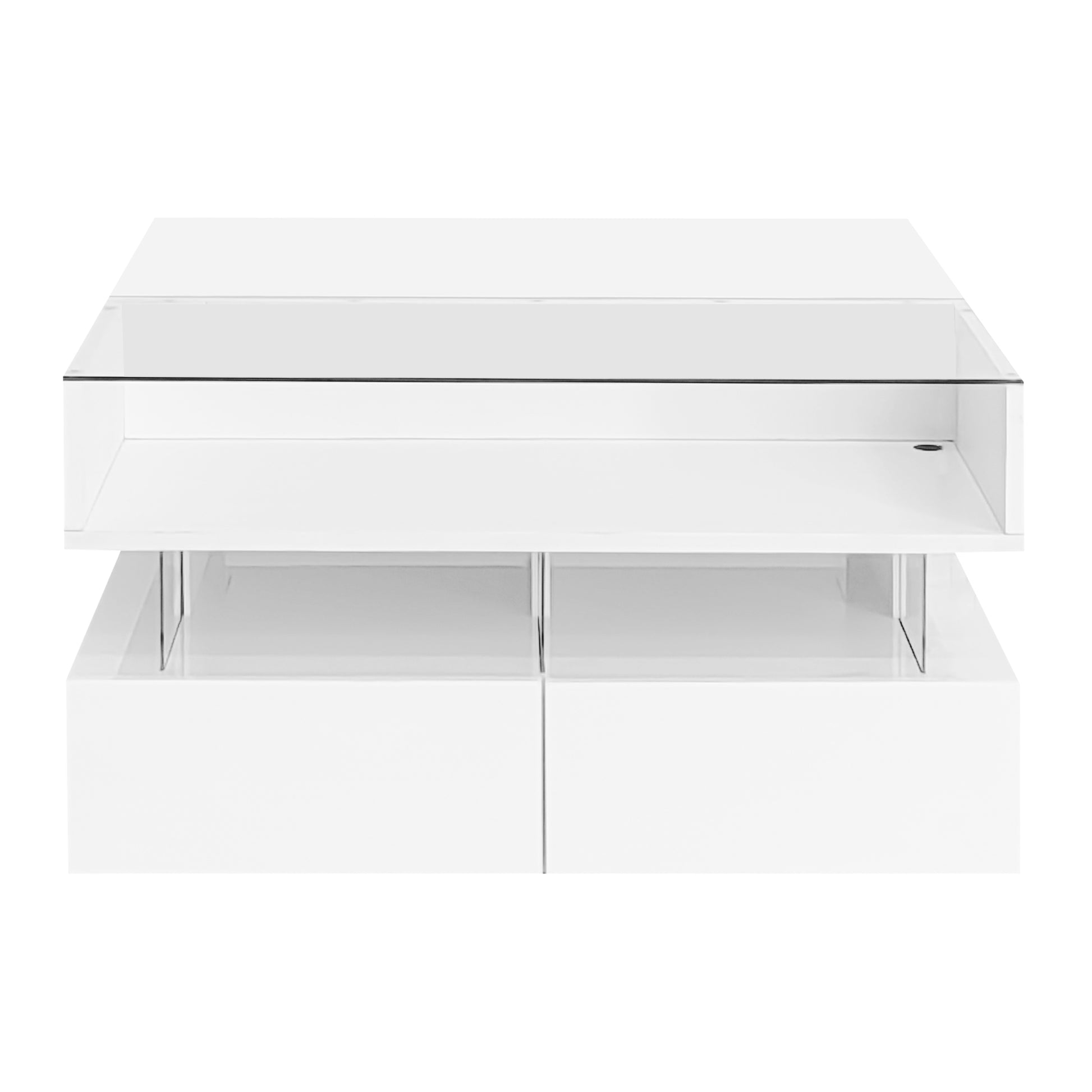 U-Can Lift-Top Coffee Table with 2 Drawers, Modern Square Coffee Table with Glass Top and High-Gloss Finish, Hidden Space and LED Lights for Living Room