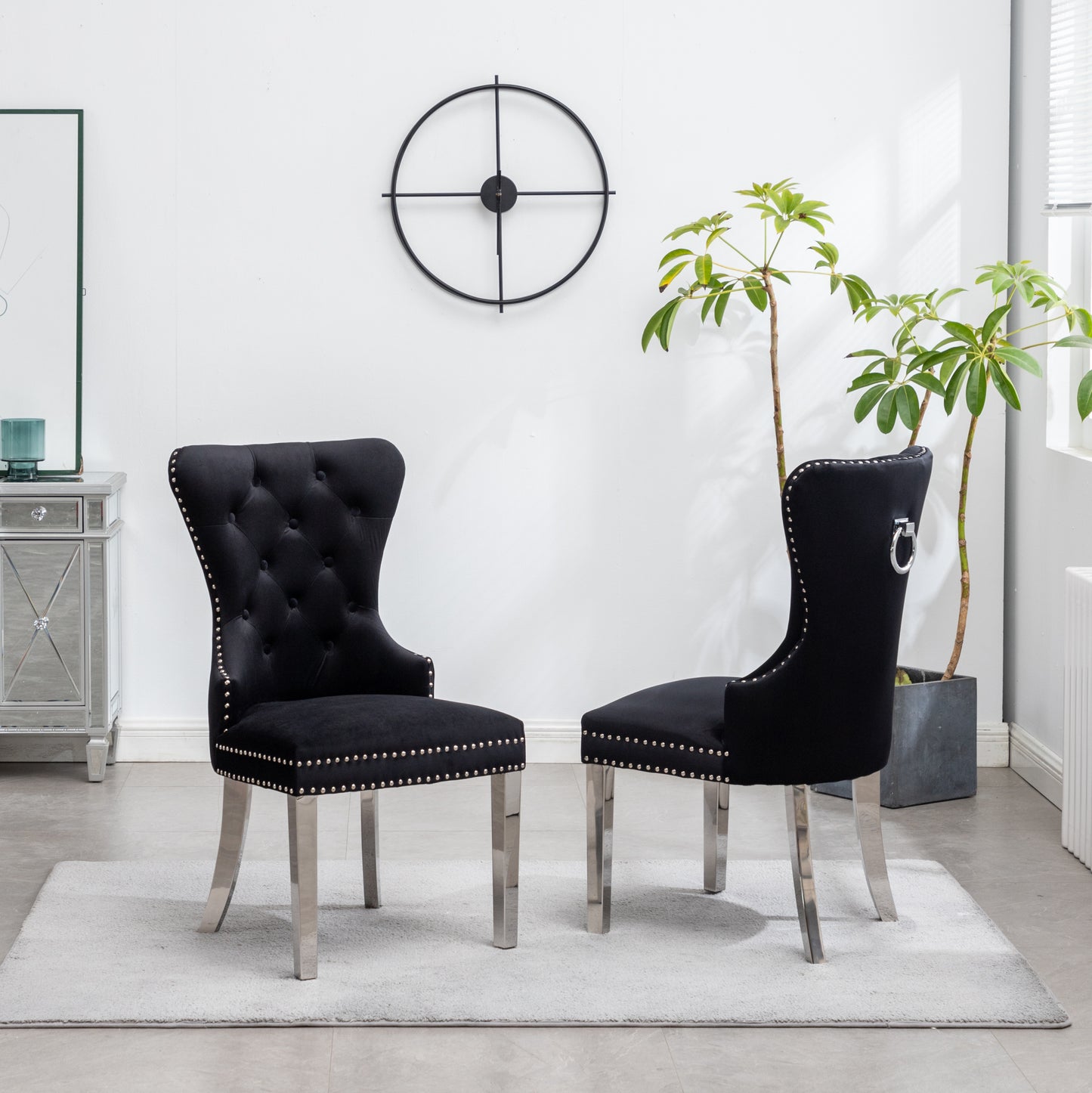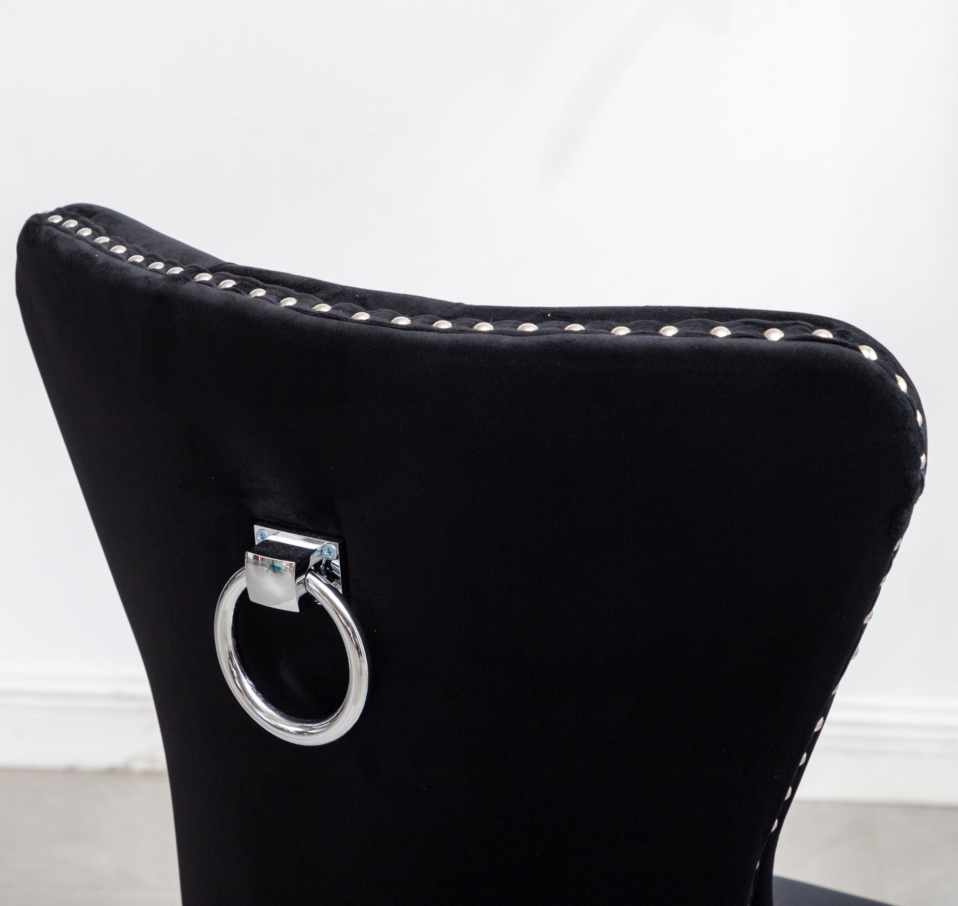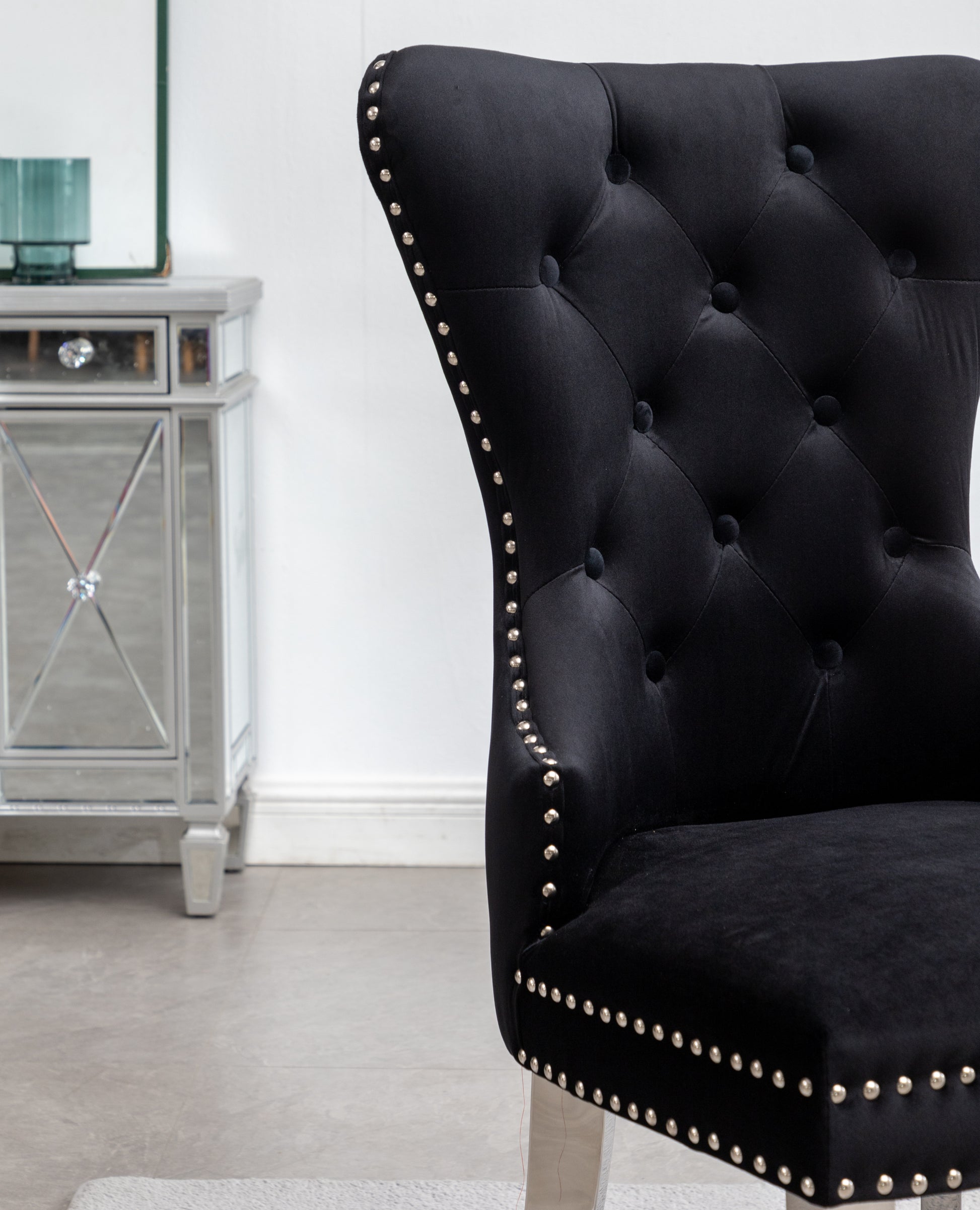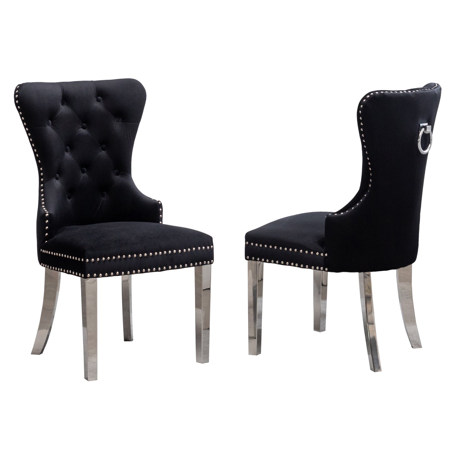 - This set includes two chairs. Beautiful button tufting and with soft velvet upholstery, a decorative ring at the back of the chair