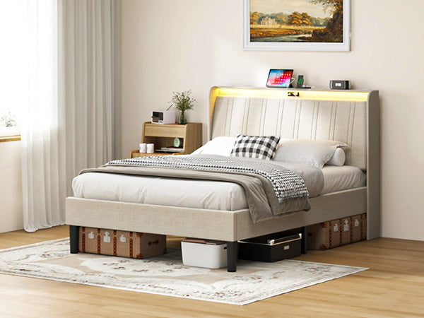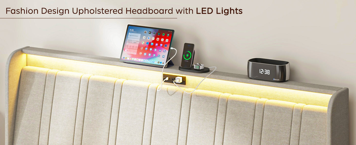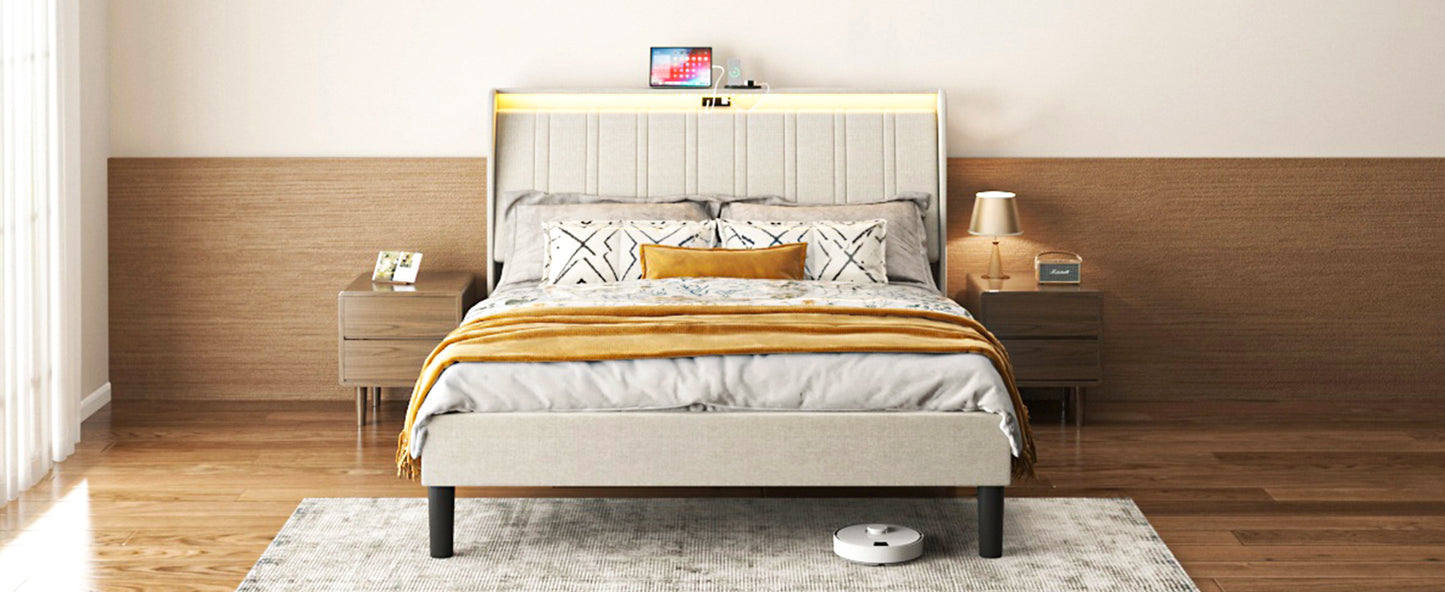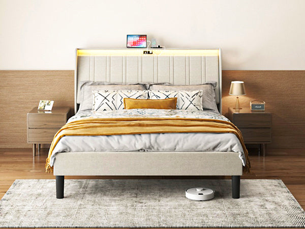 Queen Size Platform Bed Frame with Fabric Upholstered Headboard and Wooden Slats Support, Fully Upholstered Mattress