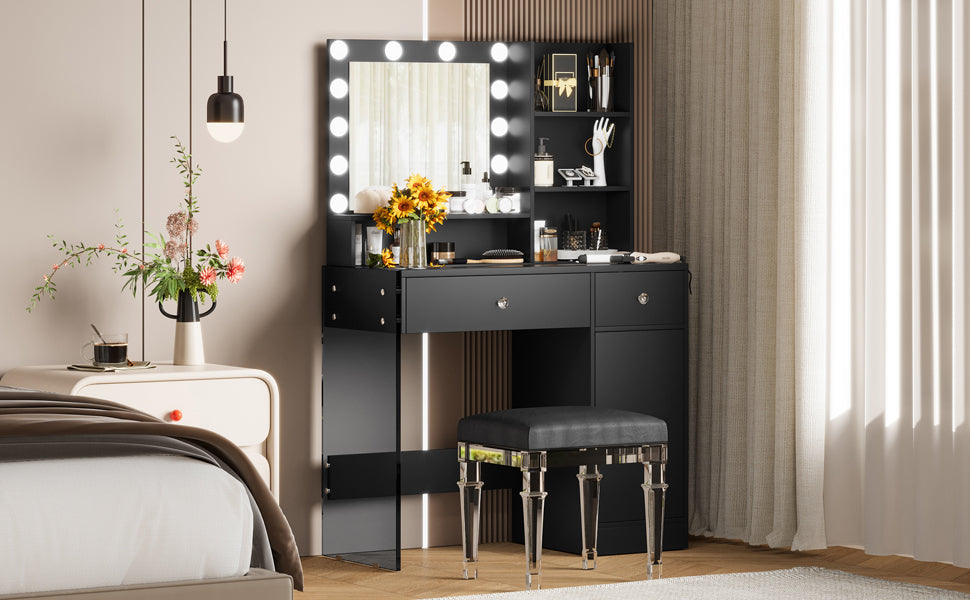 - Ample Storage Space: Equipped with 2 drawers, 1 cabinet with adjustable partitions, and open storage shelves, this vanity offers plenty of space for skincare products, jewelry, cosmetics, and makeup tools. Keep everything organized and easy to access.