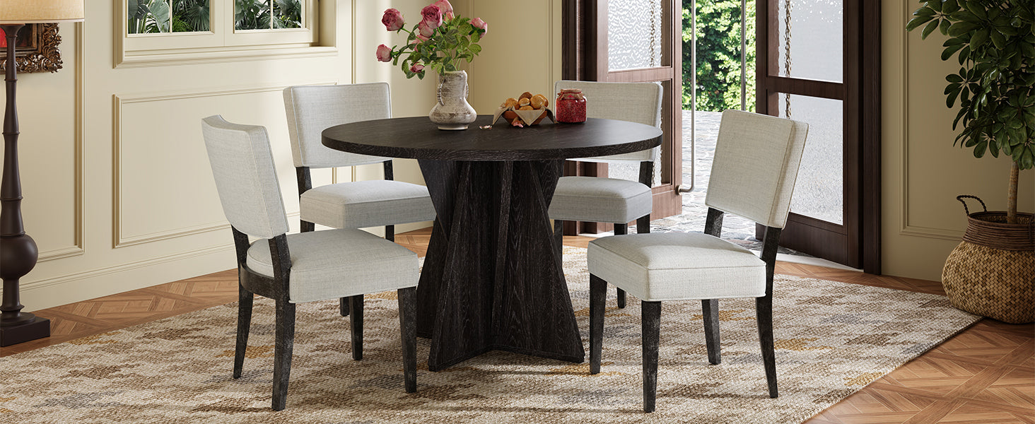 - Retro Style: Upgrade your dining space with this round dining table set for 4, featuring a round dining table and 4 upholstered chairs. The wood finish with a distressed touch adds a warm, inviting feel, perfect for farmhouse and retro interiors. The compact round shape makes it ideal for small dining areas and cozy kitchens. It’s available in two colors, Natural Wood Wash and Espresso. No matter which color dining set you choose, it will be an ideal centerpiece for any dining space.