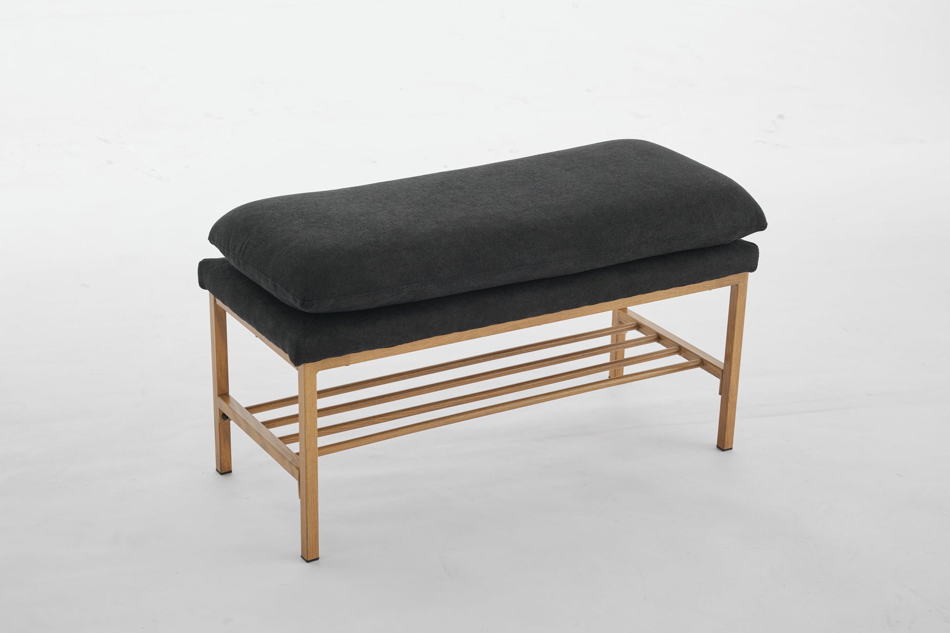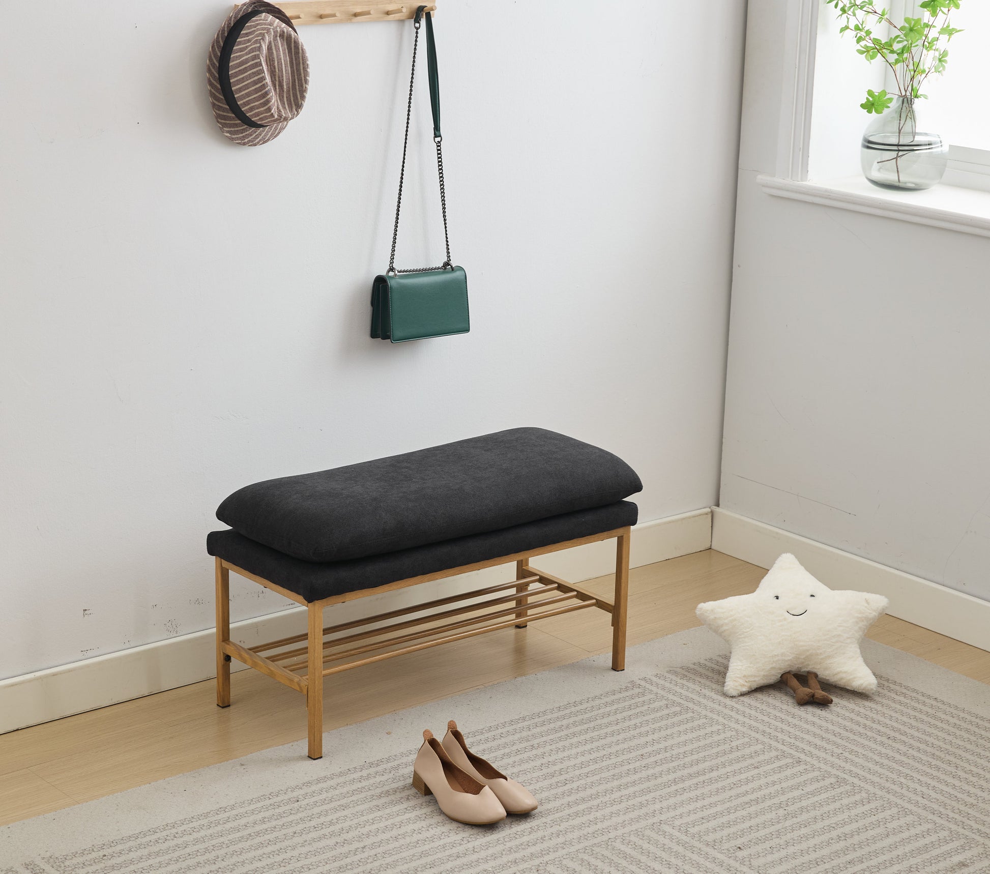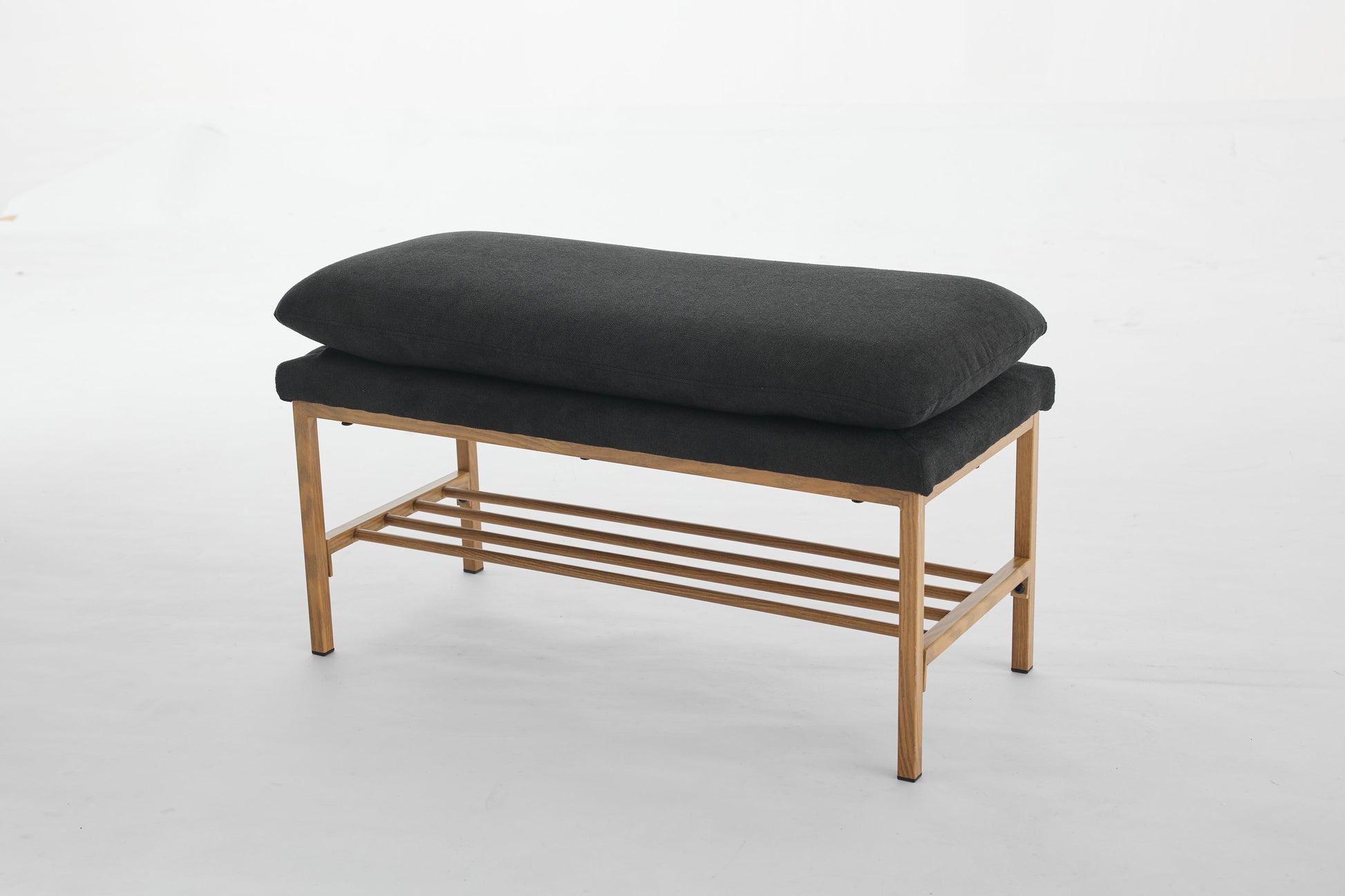 End of Bed Bench with Shelf, Linen Upholstered Storage Shoe Bench, Modern Bedroom Bench with Metal Legs for Living Room, Entryway, Dining Room, 300 LB, Linen Color(Black)