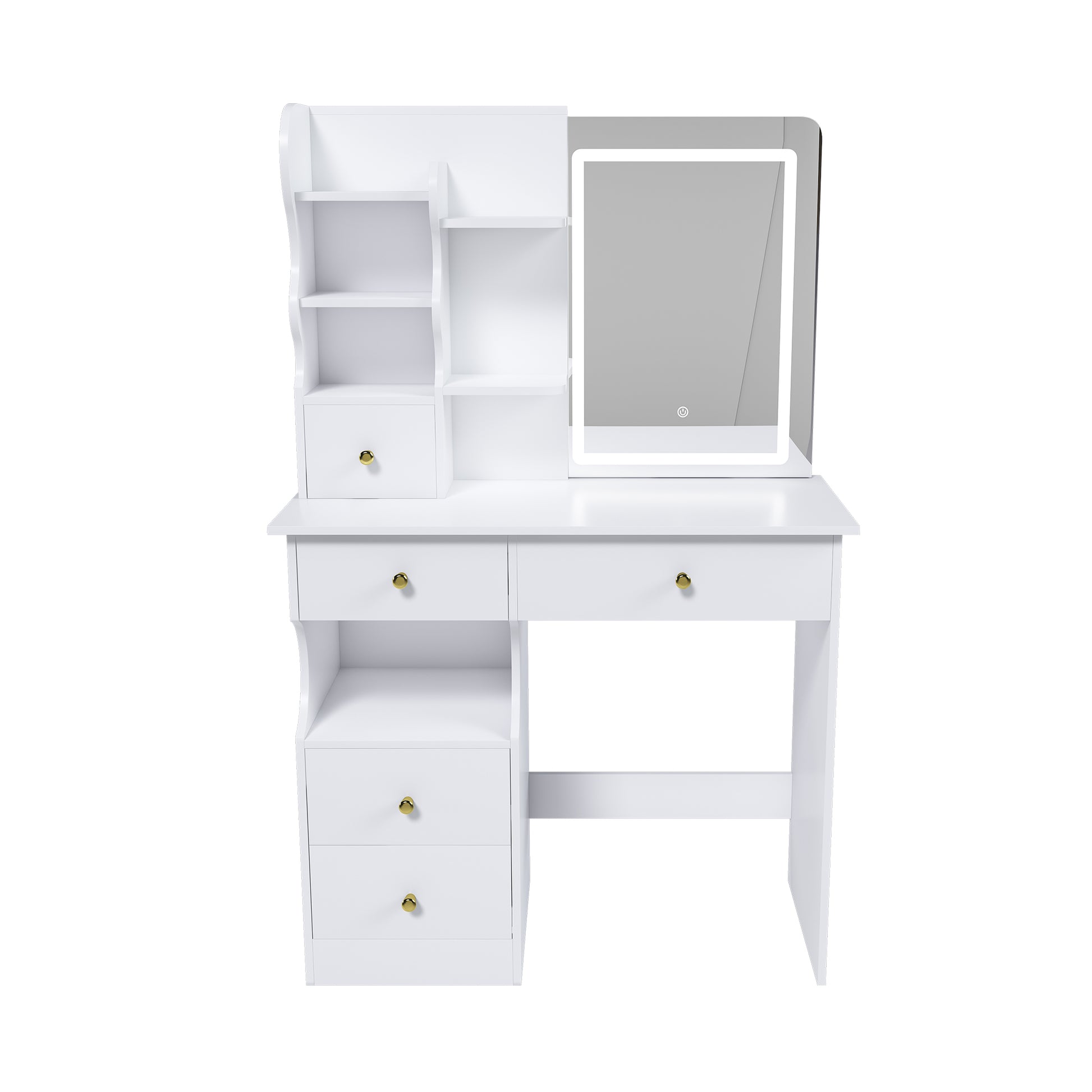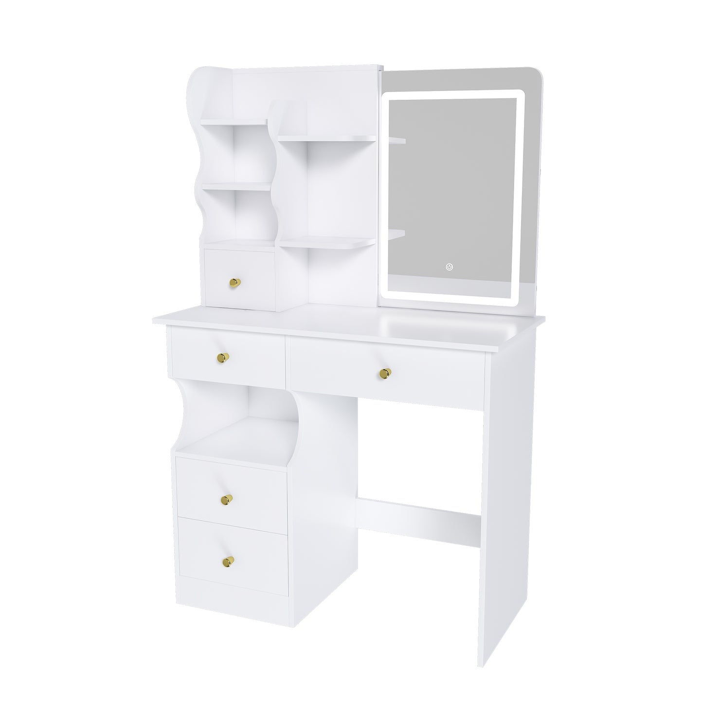 White dressing table, mirror and LED light, 5-drawer dressing table, movable and hidden mirror, 3-color mode touch screen, storage organizer for women's and girls' bedrooms