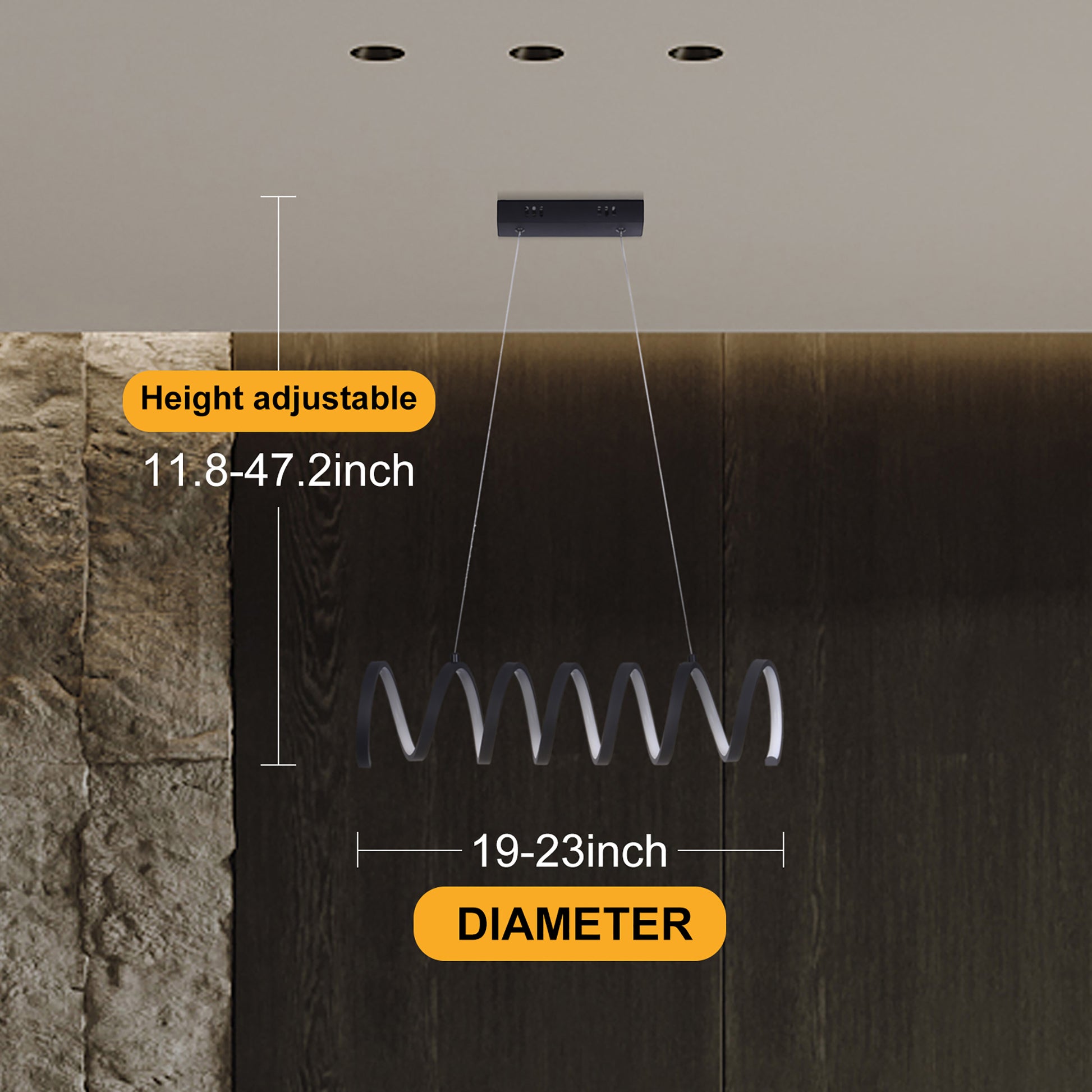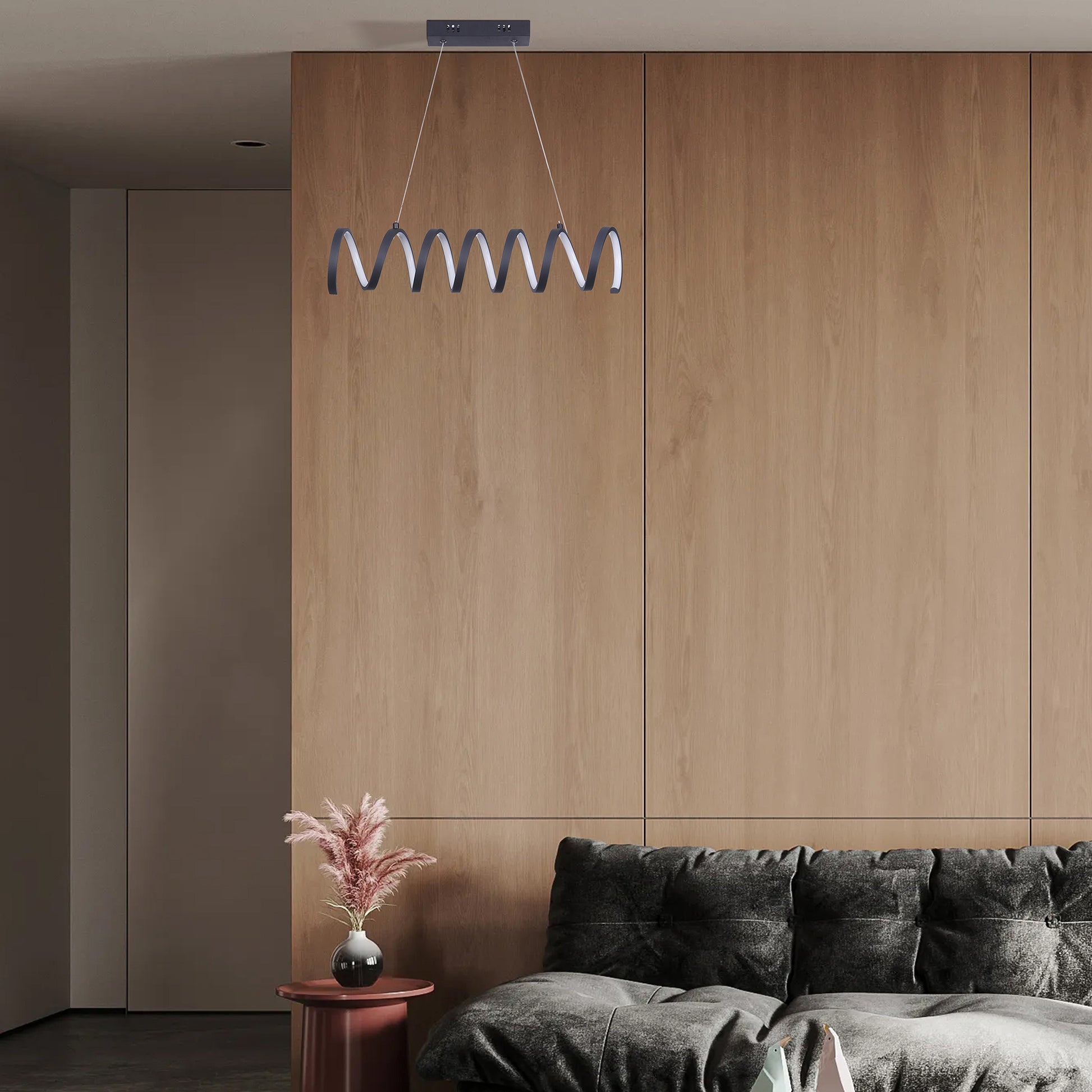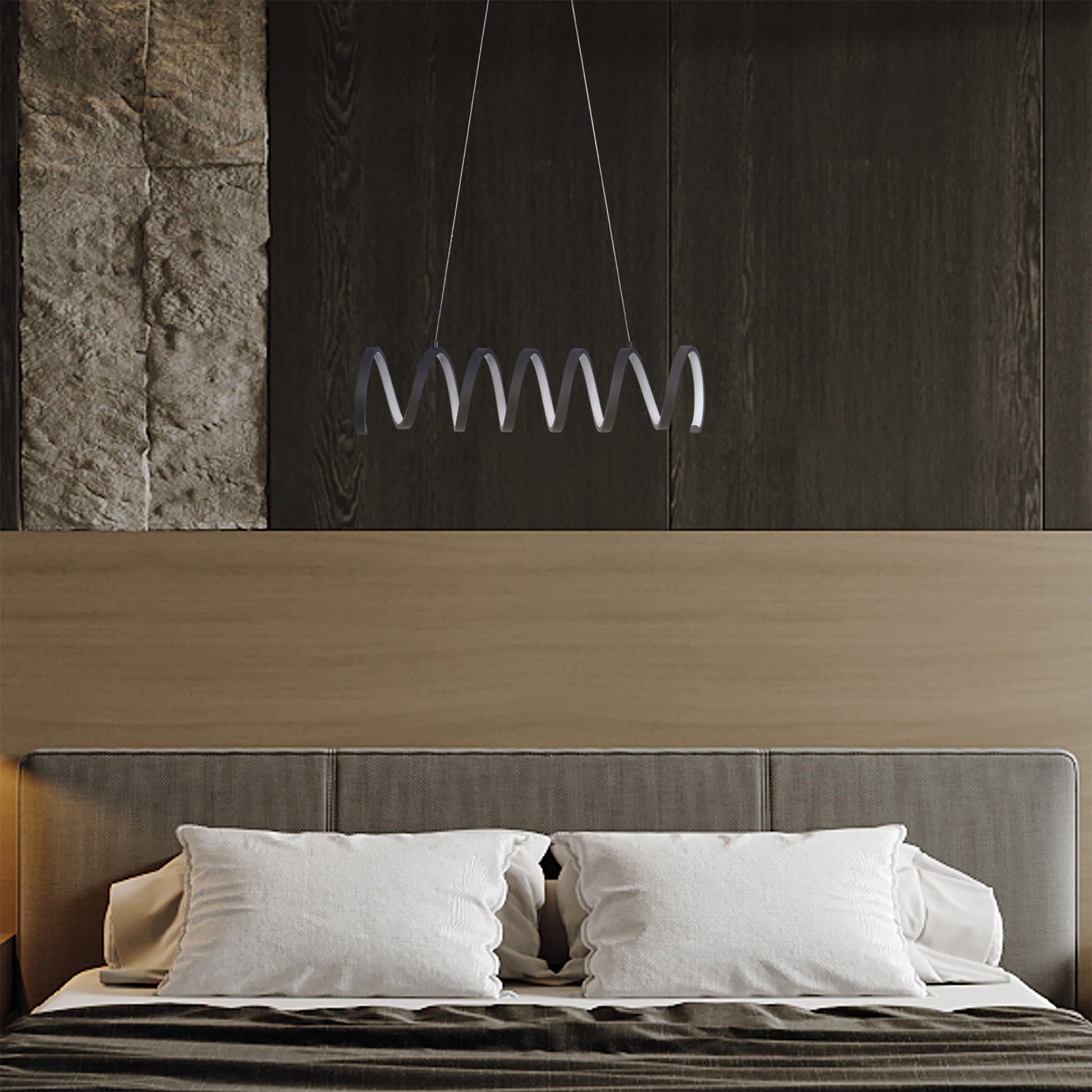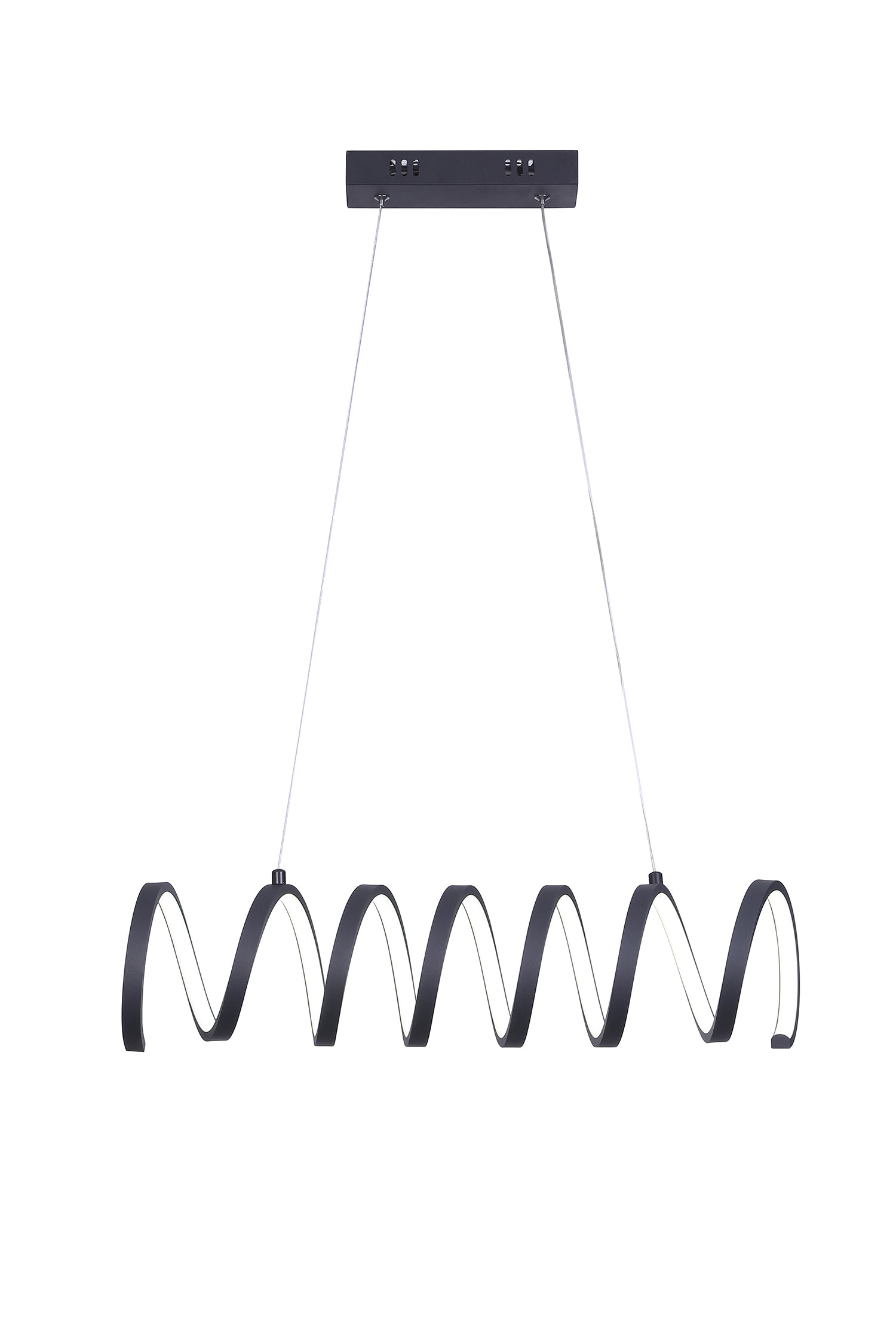 - Crafted from aluminum with a sleek matte black finish, this pendant light showcases a flowing, coiled spiral design suspended from two adjustable cords. Mounted into a ceiling backplate, it offers a striking and modern focal point for any space.