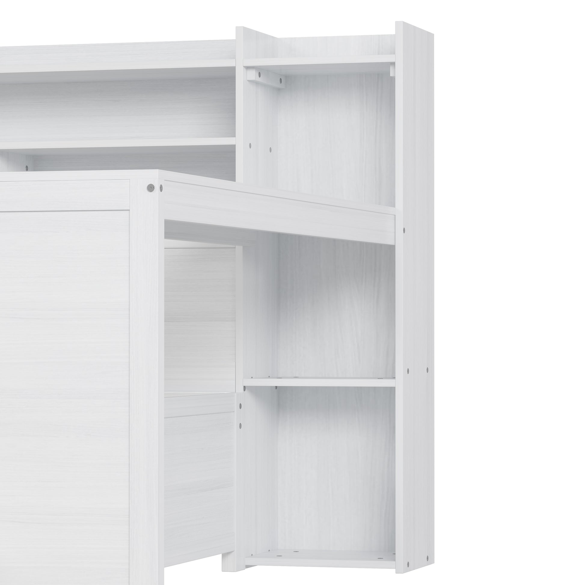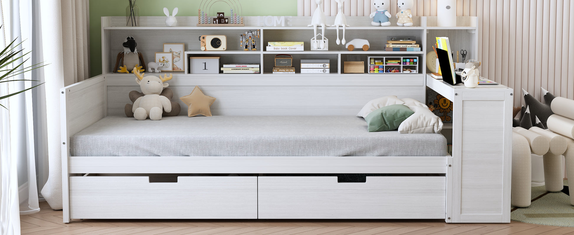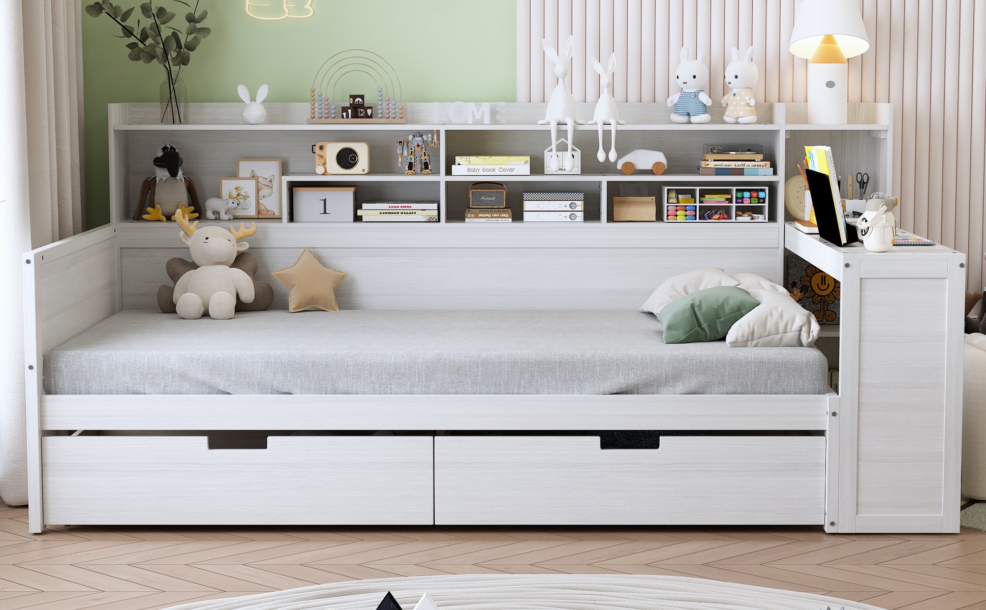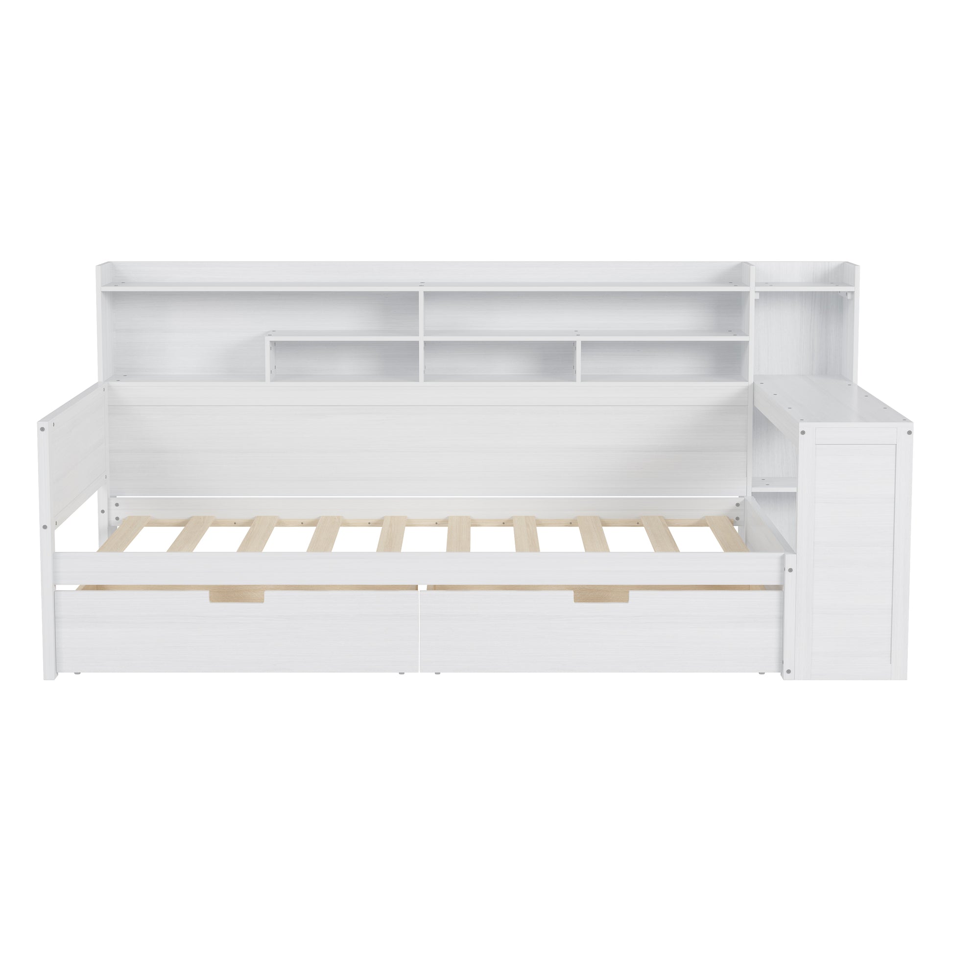 Wooden Twin Size Daybed with Storage Shelves, Multi-functional Bed with Two Storage Drawers and Study Desk, Antique White (Old SKU: HL000189AAK)