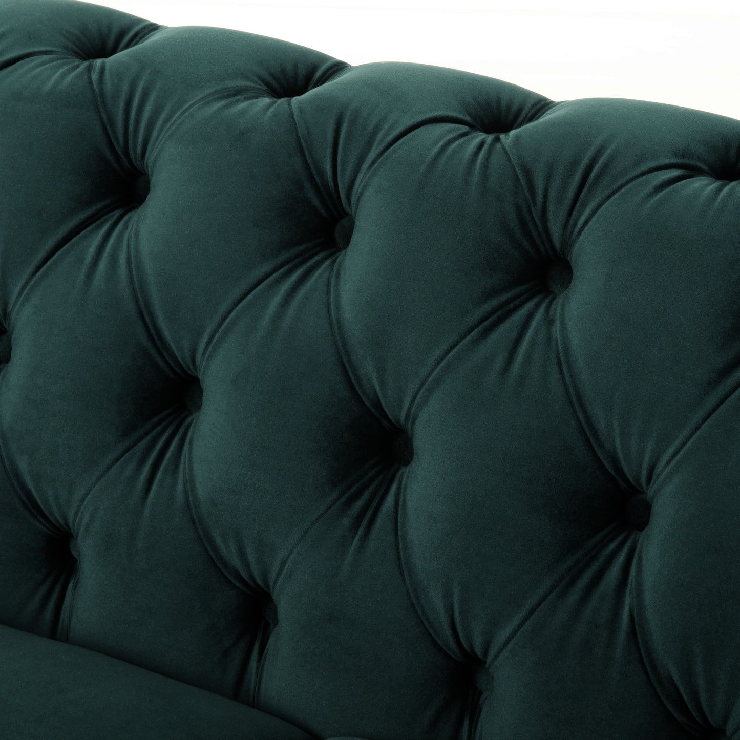 | Highlights | Pine Wood Frame // Velvet Fabric // Loveseat // Rolled Arm // Chesterfield Design // Tufted Button // 300lbs/Seat Weight Capacity // 3 Colors Available |
