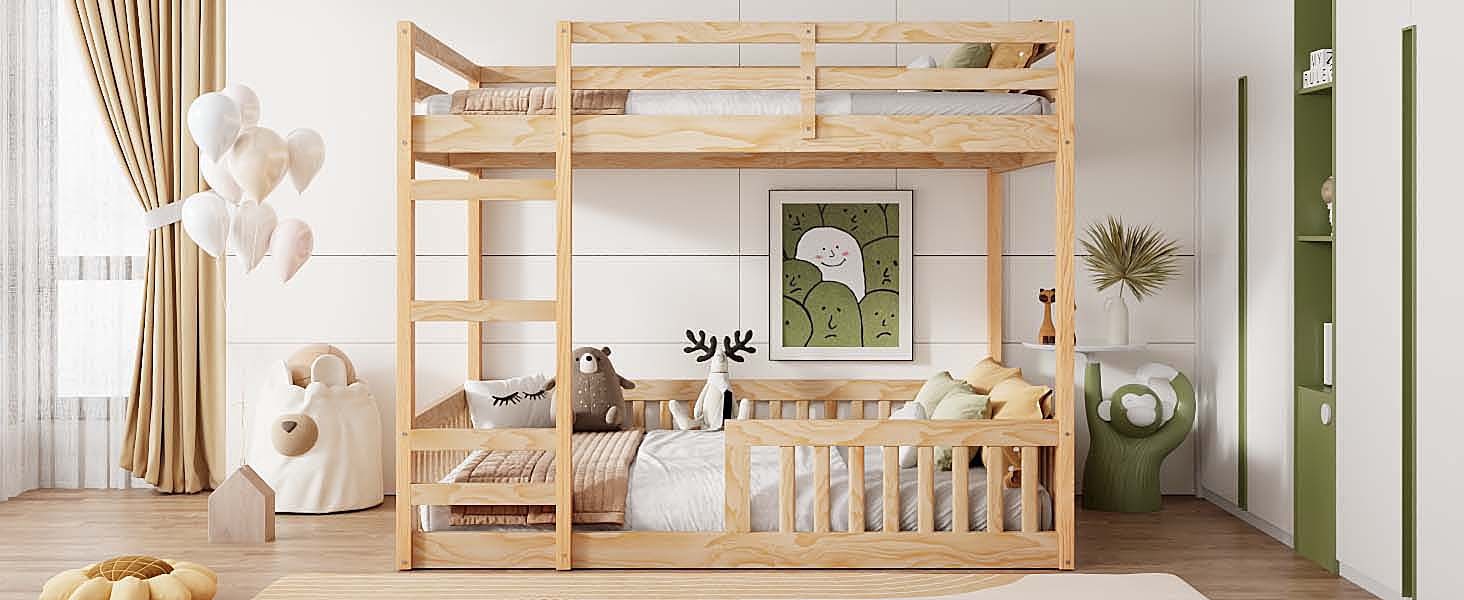 - [Safety Guaranteed] Solid wood slats blend naturally into the already sturdy frame to give added ground-up support that provides stability. Both the upper and lower beds are equipped with guardrails for greater safety.