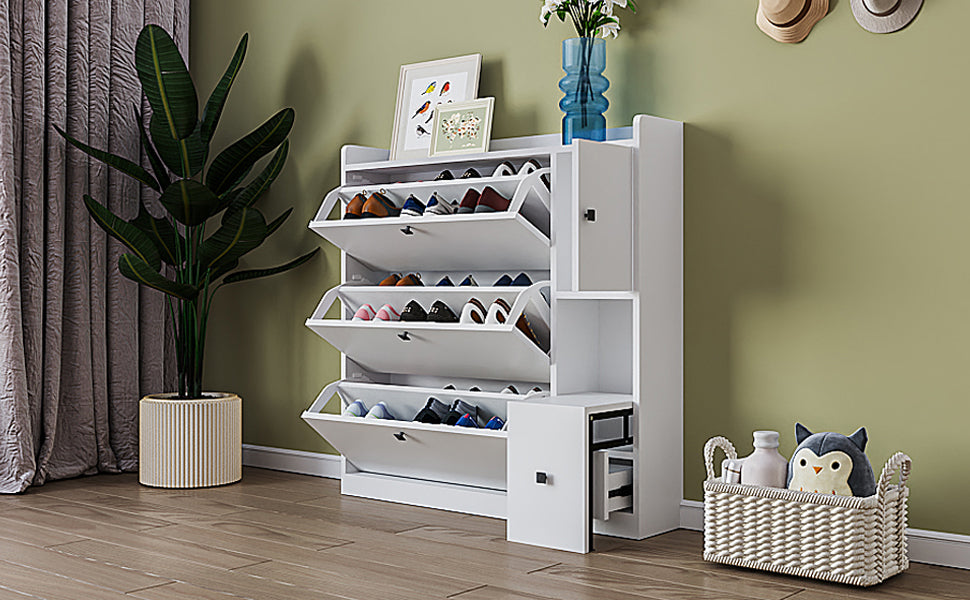 ON-TREND Versatile Tipping Bucket Shoe Cabinet with 3 Flip Drawers, Maximum Storage Entryway Organizer with Drawer, Free Standing Shoe Rack with Pull-down Seat for Hallway, White
