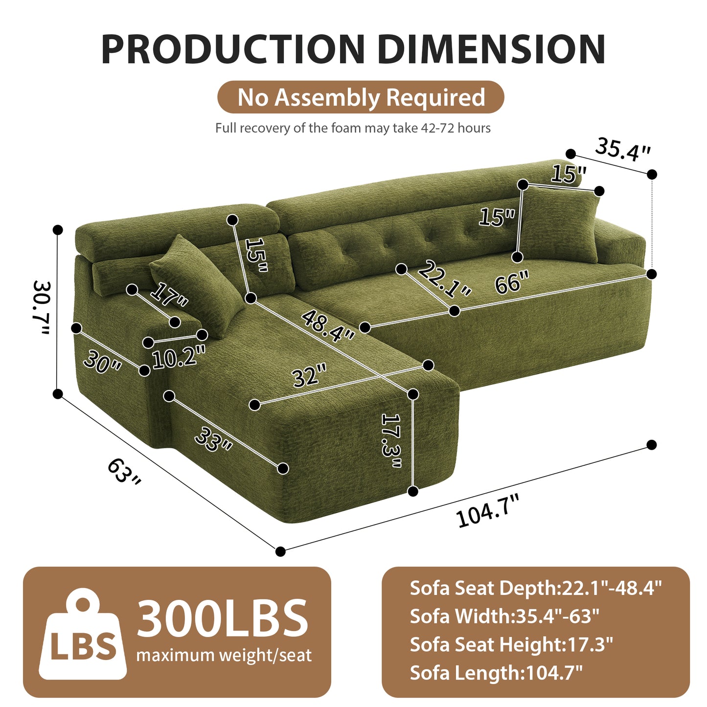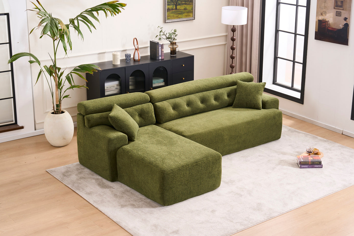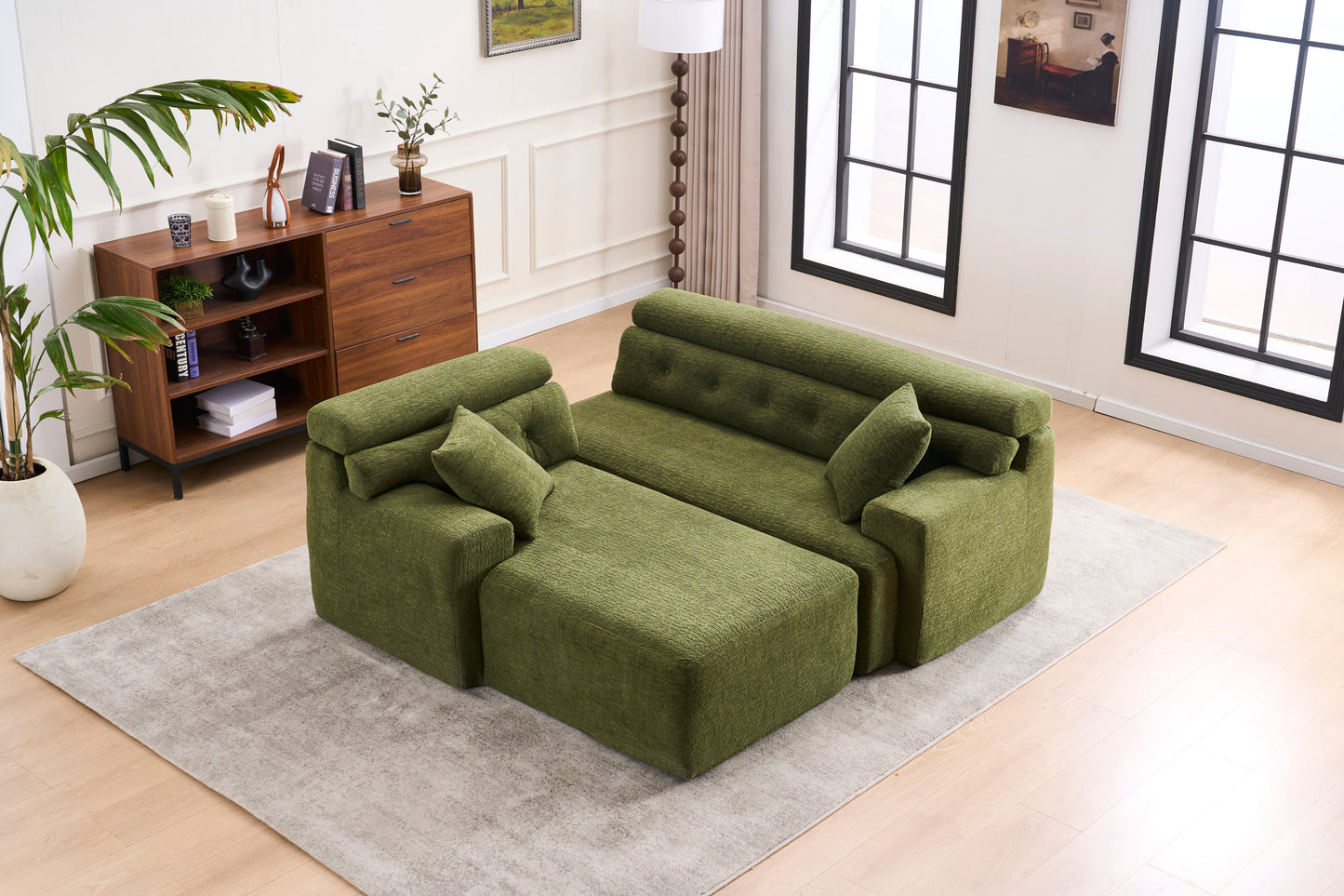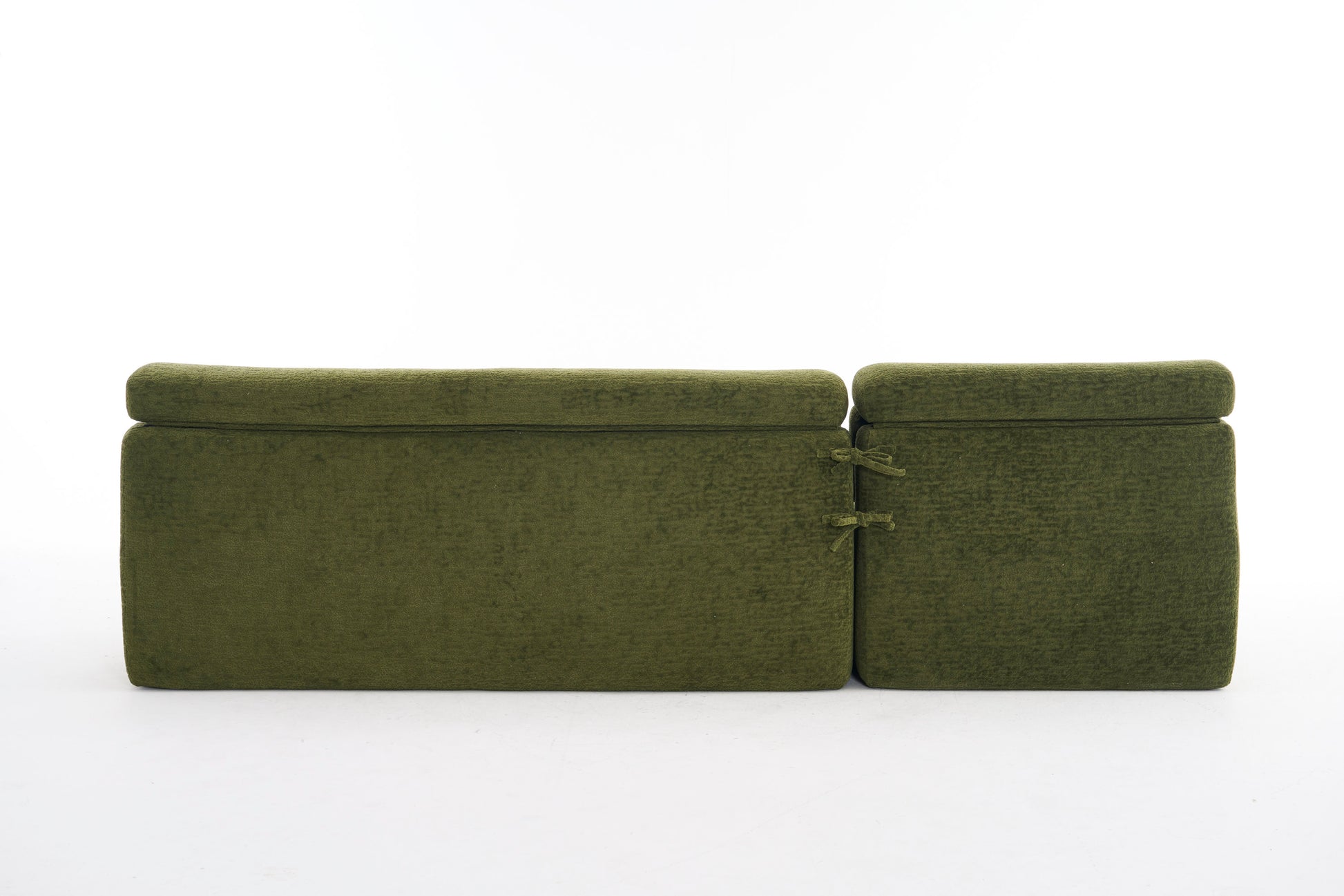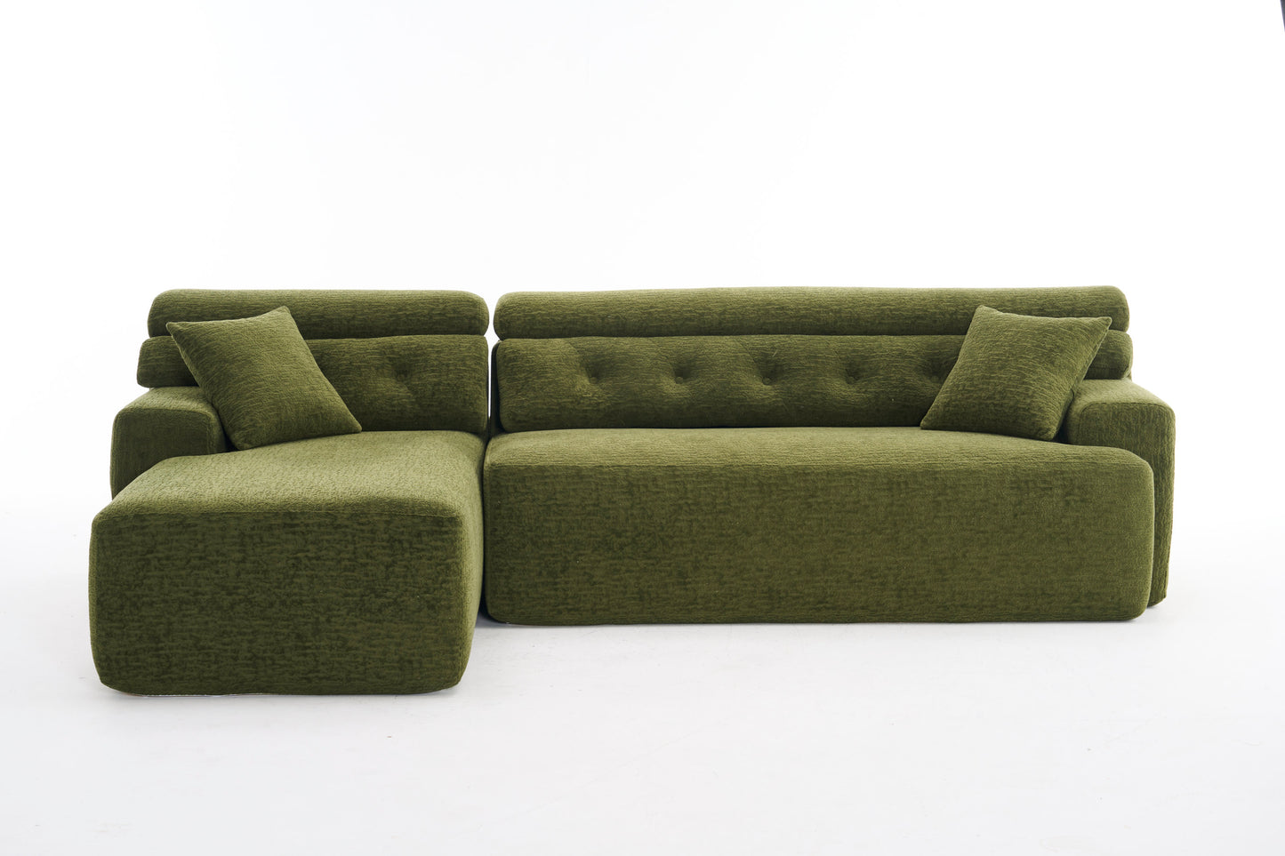 LY-029B Convertible Chaise Sectional Sofa, Full Compression Sponge Modular Couch for Apartment Living Room,Green 3-Seater with Wood Grain Chenille, 2 Pillows Included, 86'L