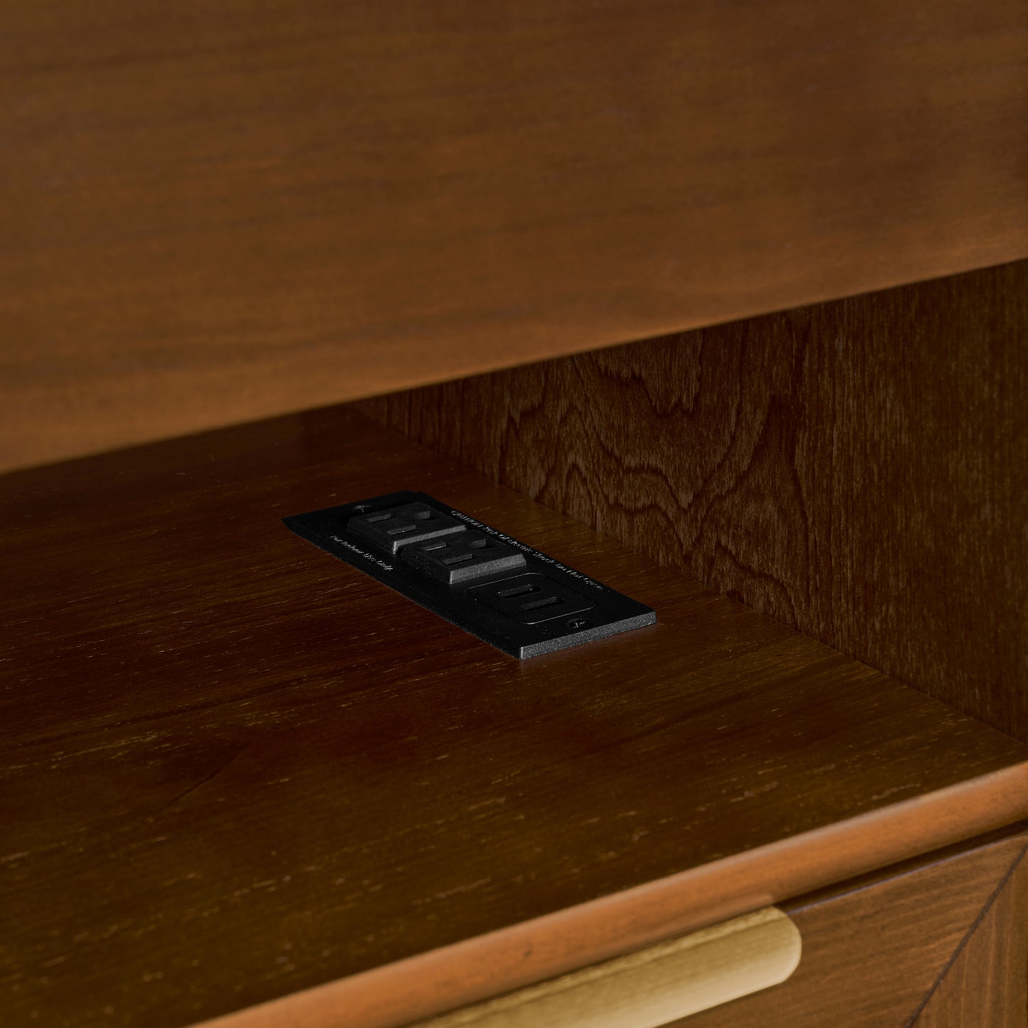 Mid Century Modern Nightstand with Charging Station & Outlet Hole & 2 Drawers, Farmhouse End Table with Open Shelf & Glass Drawer Dresser, Side Cabinet for Living Room Reception Room Dorm, Dark Walnut
