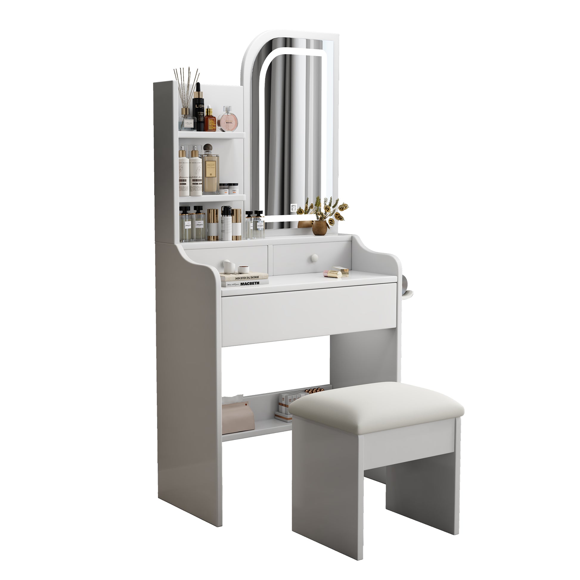 Fashion Vanity Desk with Mirror and Lights for Makeup with hair dryer holder and Chair, Vanity Mirror with Lights and Table Set with 3 Color Lighting Brightness Adjustable, 3 Drawers, White Color