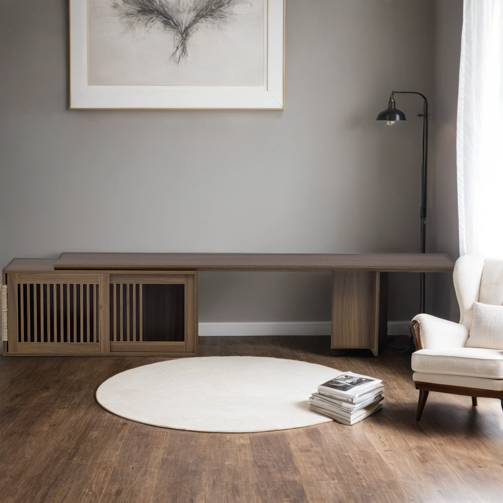 Mid-Century Modern 2 in 1 PET FRIENDLY Walnut TV Stand With Extendable table Soft cushion Sliding door Cat friendly furniture