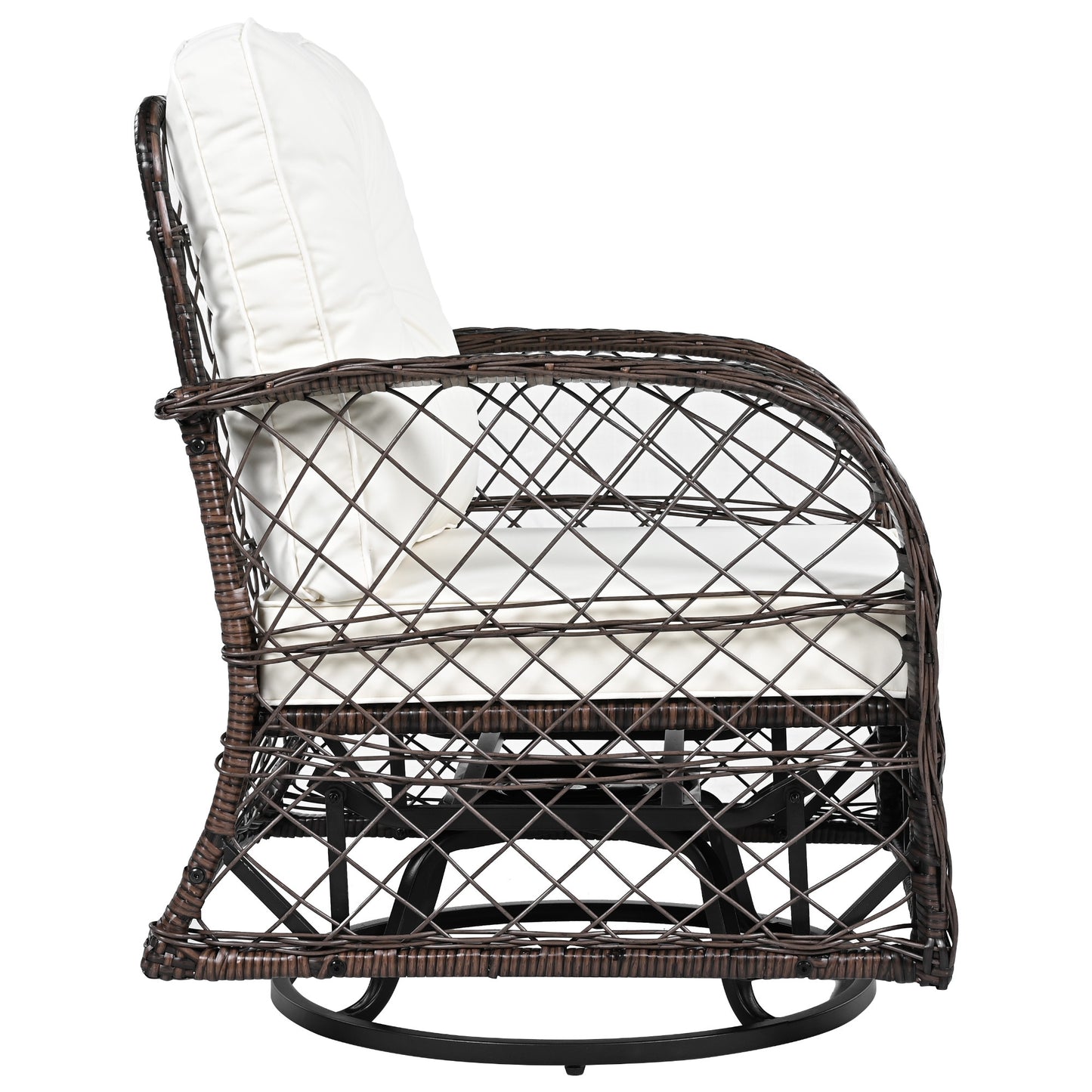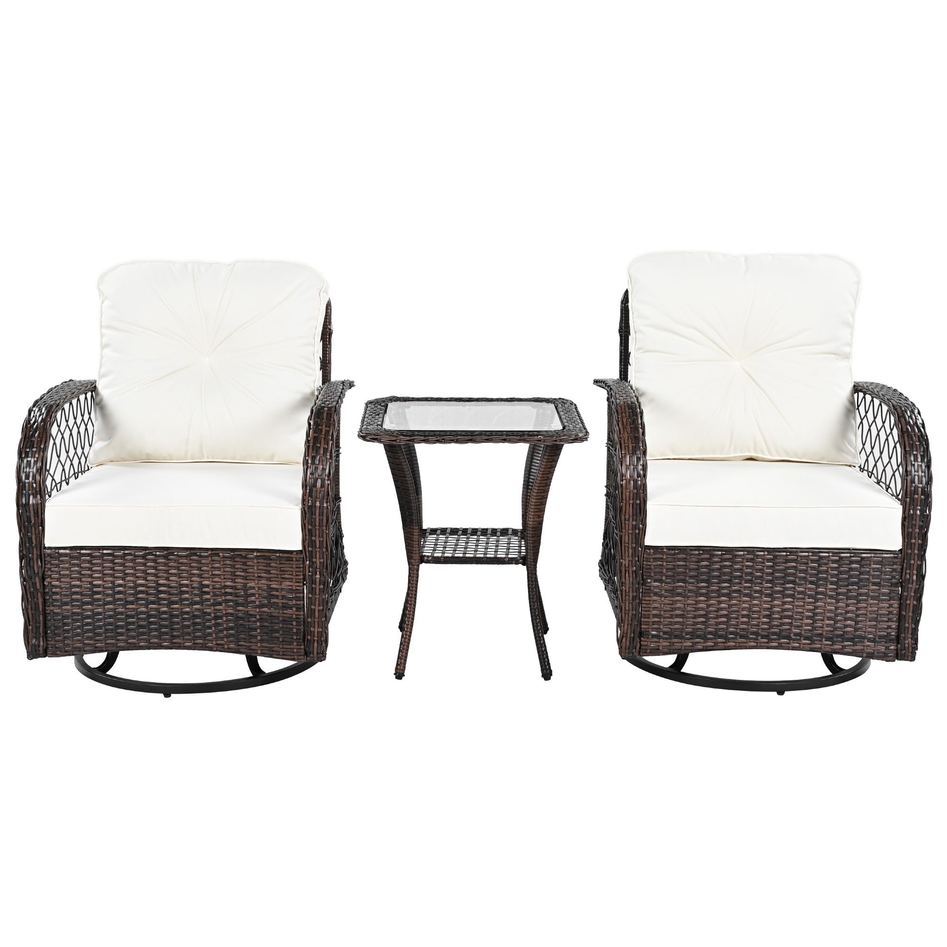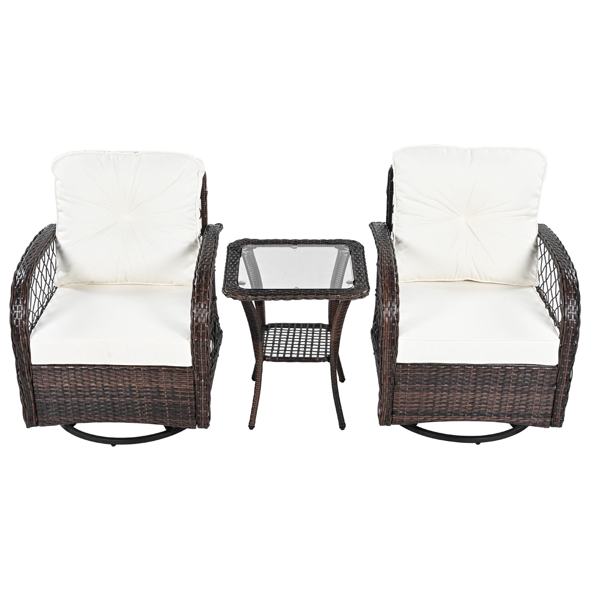 3-piece Outdoor Chair&Table Set Chat Set 2-person Rattan Seating Group with Two Swiveling and Rocking Chairs and a Square Table for Garden, Patio, or Balcony, Brown