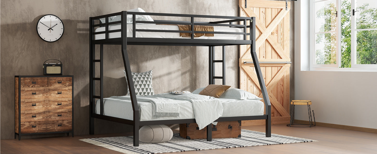 Feature upper bed is Twin size and bottom bed is Full size. The metal bunk bed constructed with a sturdy quality and thicker steel frame that for stability and durability, make the bunk bed not wobbling and allowing users to sleep soundly.