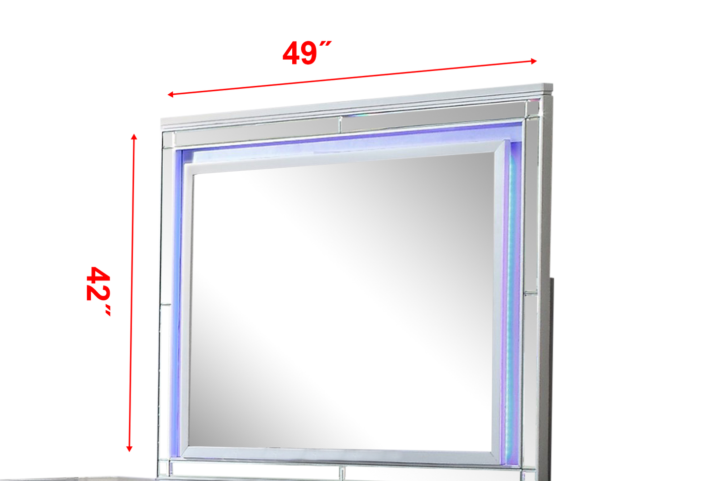 The perfect mixture of the latest technology, style, utility, and comfort. This Lizelle King 5PC Bedroom Set is the ultimate standard of modern-day furniture technology. The bed is one of a kind and equipped with a display of a fireplace on its headboard. The fireplace will create an ambiance in your room like no other bedroom set on the market. It includes a remote that can change the fireplace display in 6 different colors. The fireplace is for display only and DOES NOT EMIT HEAT. The bed also has USB and Bluetooth speakers, making it convenient to charge your phones and listen to your favorite music with top-quality inbuilt speakers. The footboard and side rails have a unique design padded with velvet upholstery. The tall headboard size will give your room a broader feel, and the velvet upholstery material will mesmerize you at every touch. Available in Grey, Blue, Beige, and Black colors. We take pride in being the first pioneers in implementing such a design/technology and can assure you that you won't find a similar set anywhere else in the market. This bed collection is revolutionary for many reasons. Get yours now before it's too late. We assure you that this will surpass your expectations. This set includes the Lizelle King size bed, 2 drawer Night stand, 9 drawer dresser with Mirror, and 5 drawer chest of drawers.