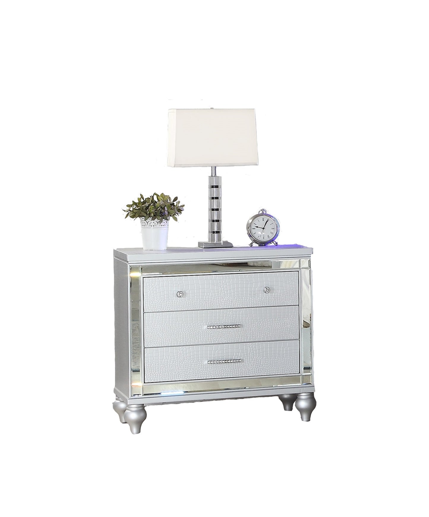 - English dovetail drawer construction with full extension metal ball bearing drawer glide. Frame material is blended solid and manufactured wood all all case goods are finished in Silver color with mirror accents.