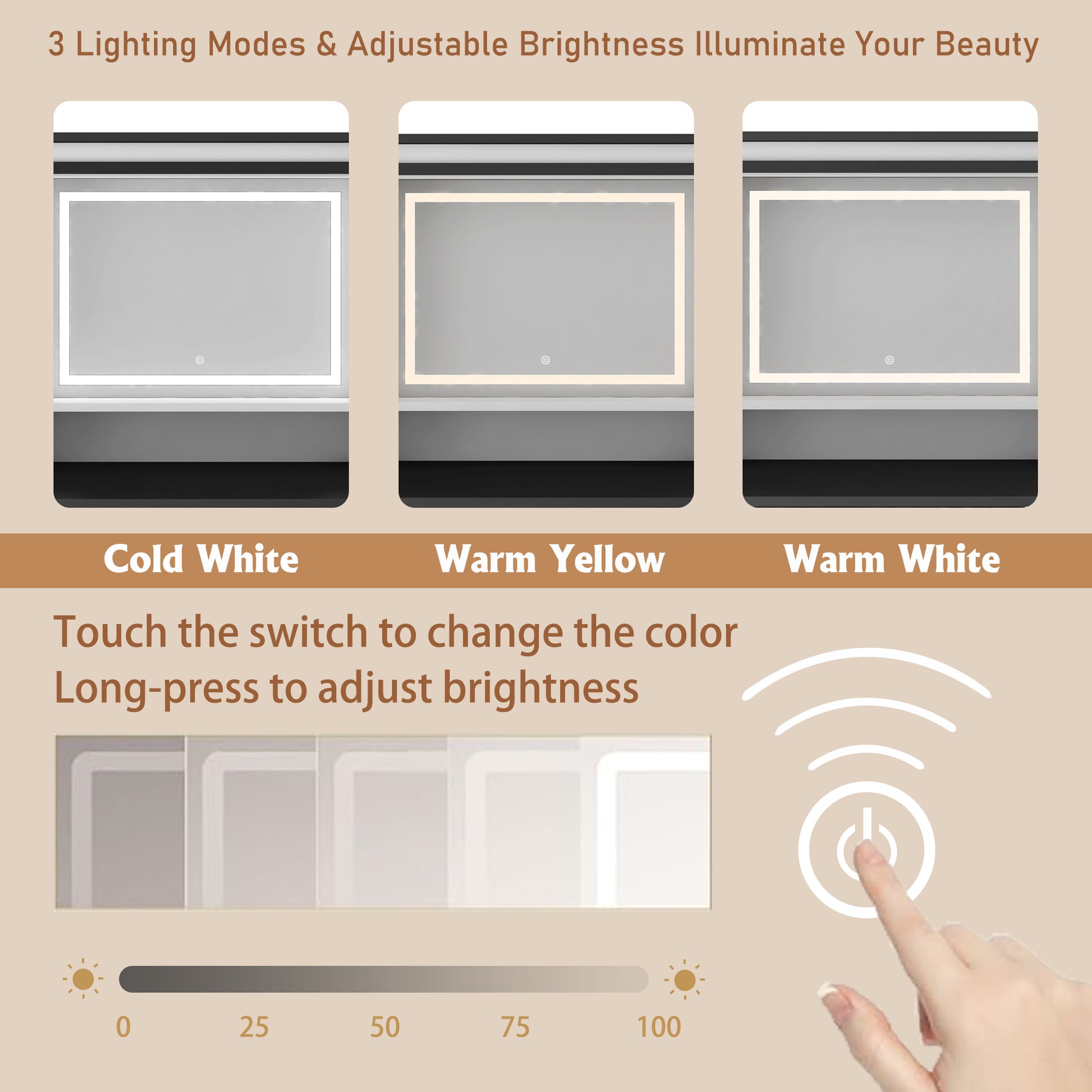 - Touch Control Lighting Mirror, lightly touch the mirror's button to adjust the 3 included color modes. Long press to adjust the brightness in each light mode
