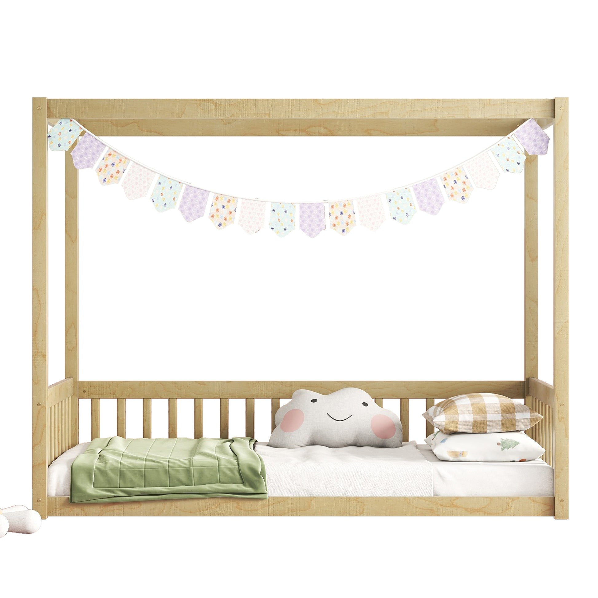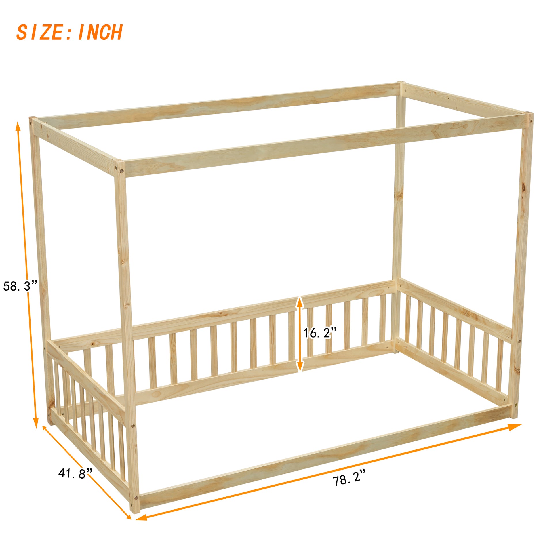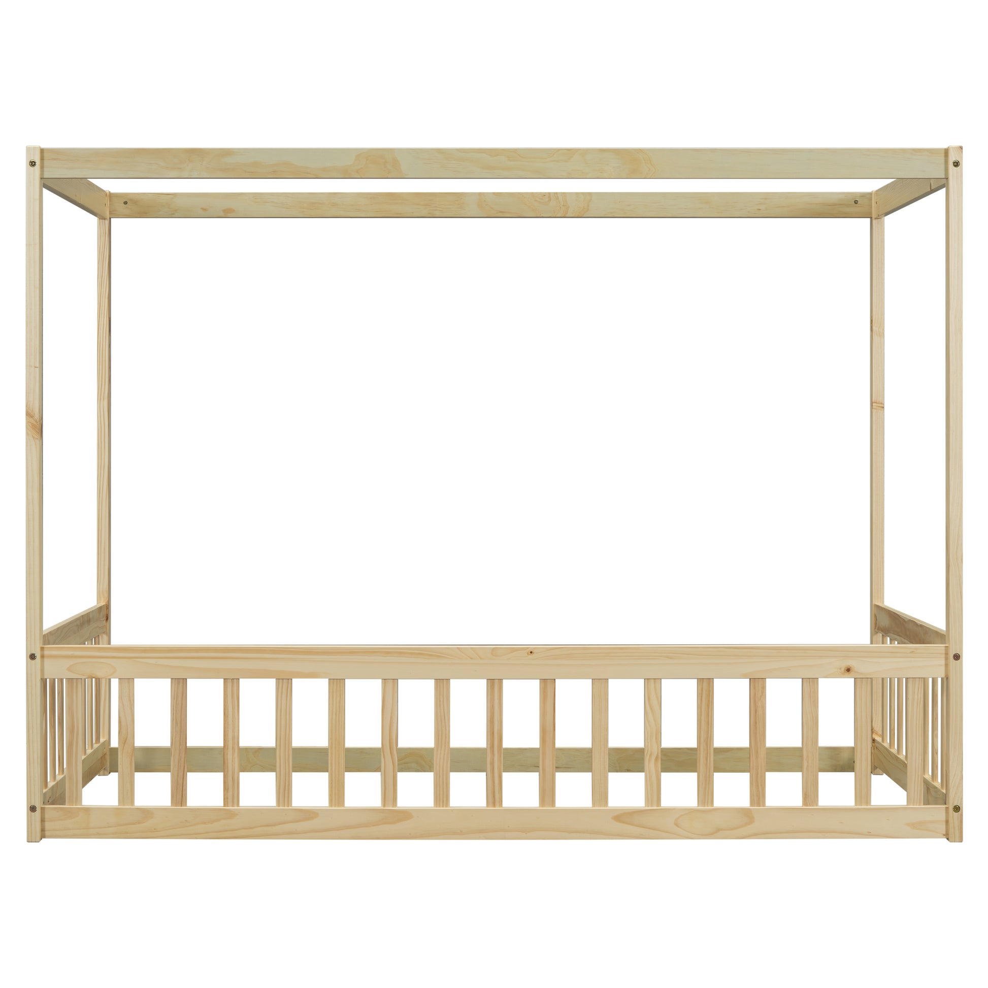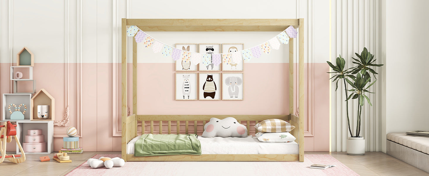 Twin Size Canopy Frame Floor Bed with Fence, Guardrails,Natural