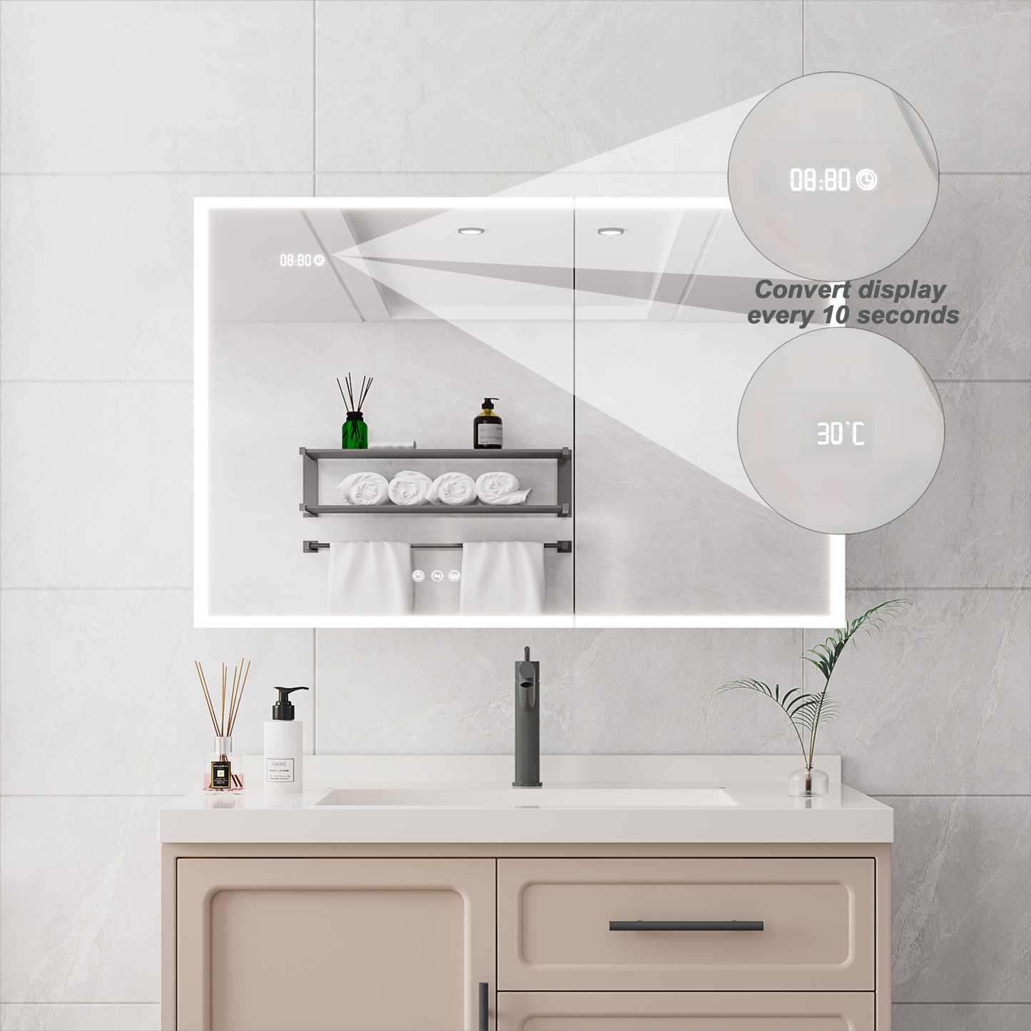 Time display and temperature display on the mirror(cycle conversion display: interval of 10 seconds)