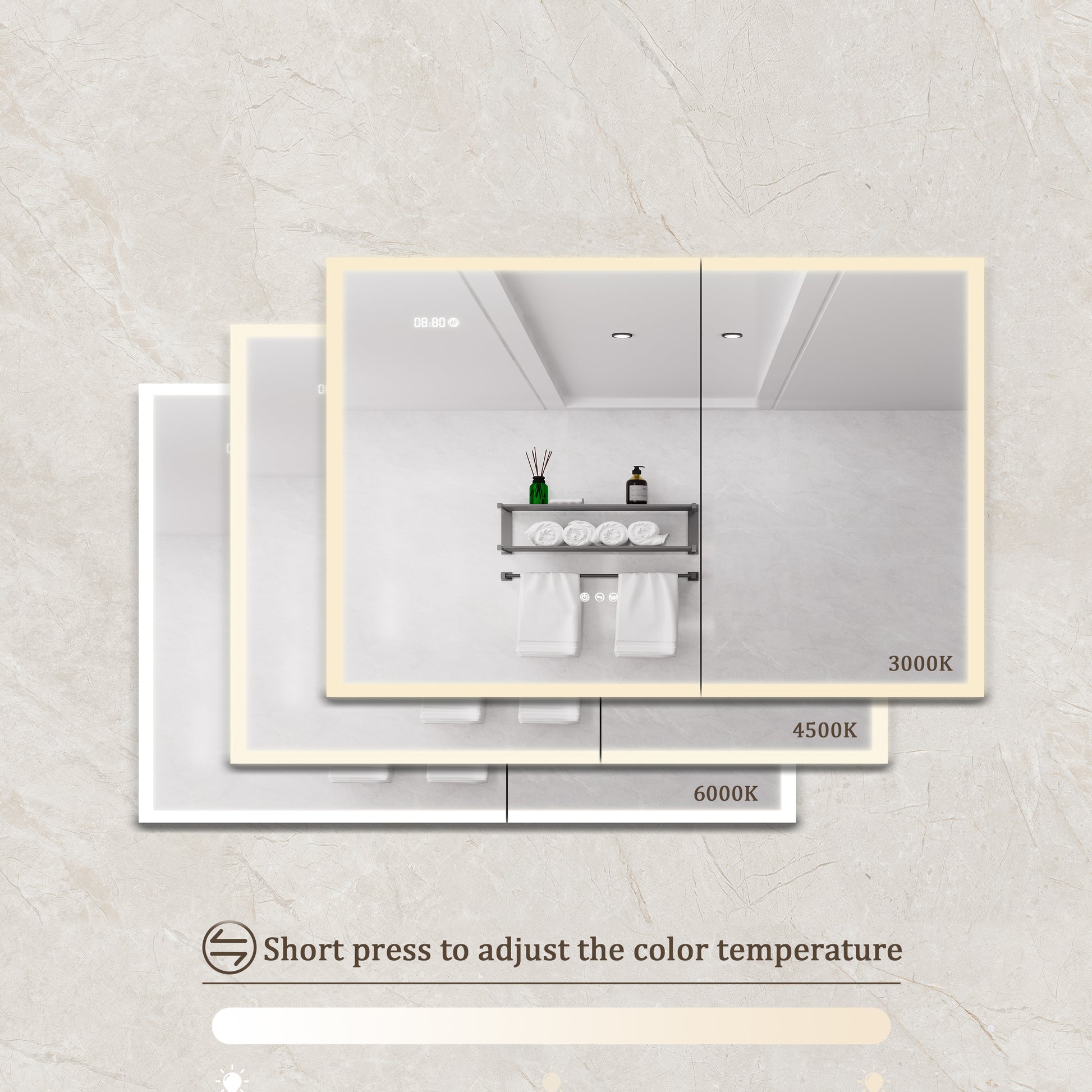 You can freely switch the color temperature of the lighting according to your bathroom environment, and according to usage habits, you can also adjust the more suitable color temperature of the lighting to adapt your eyes. In addition, the light color temperature has a memory function, and when you turn on the light, it will display the previous light setting before turning it off