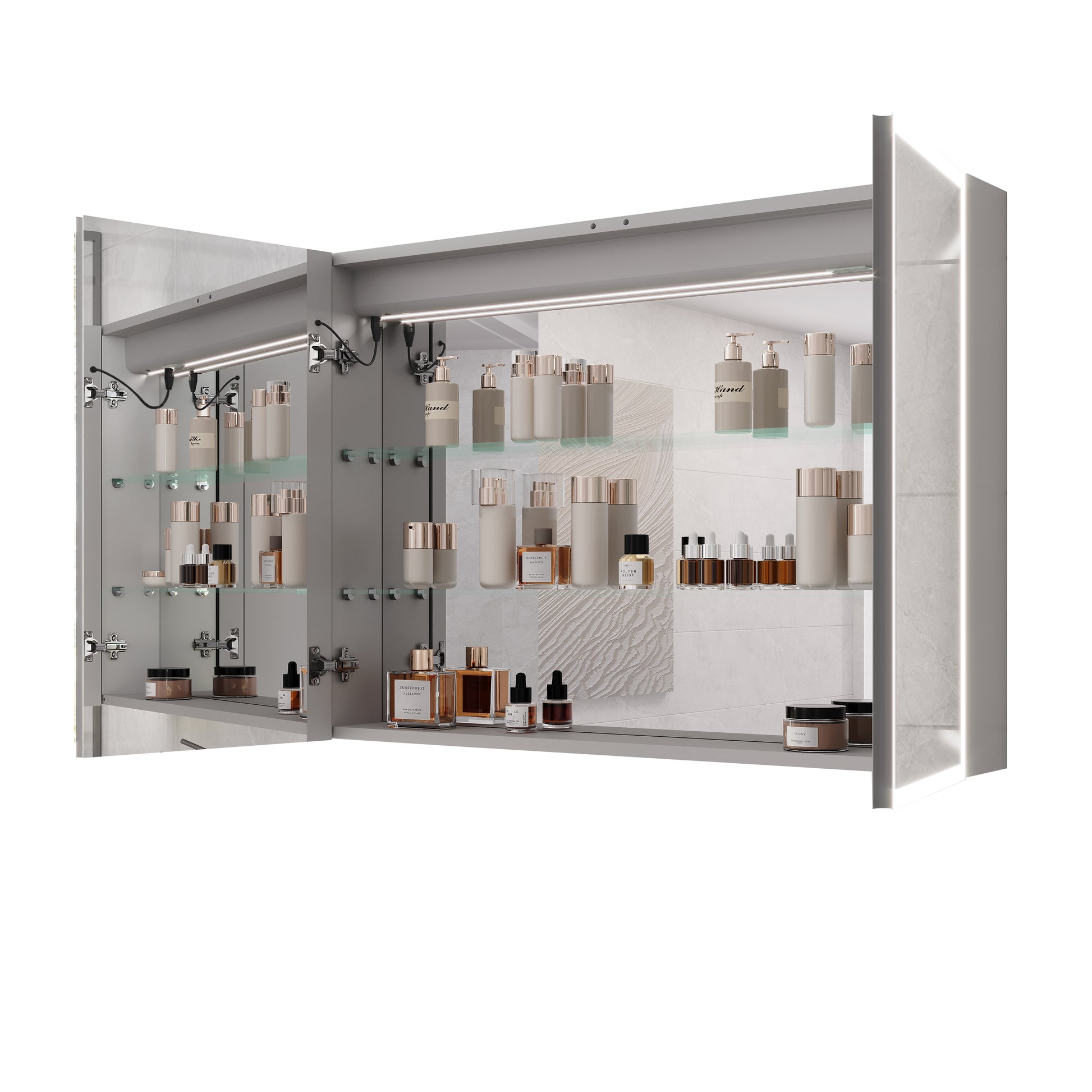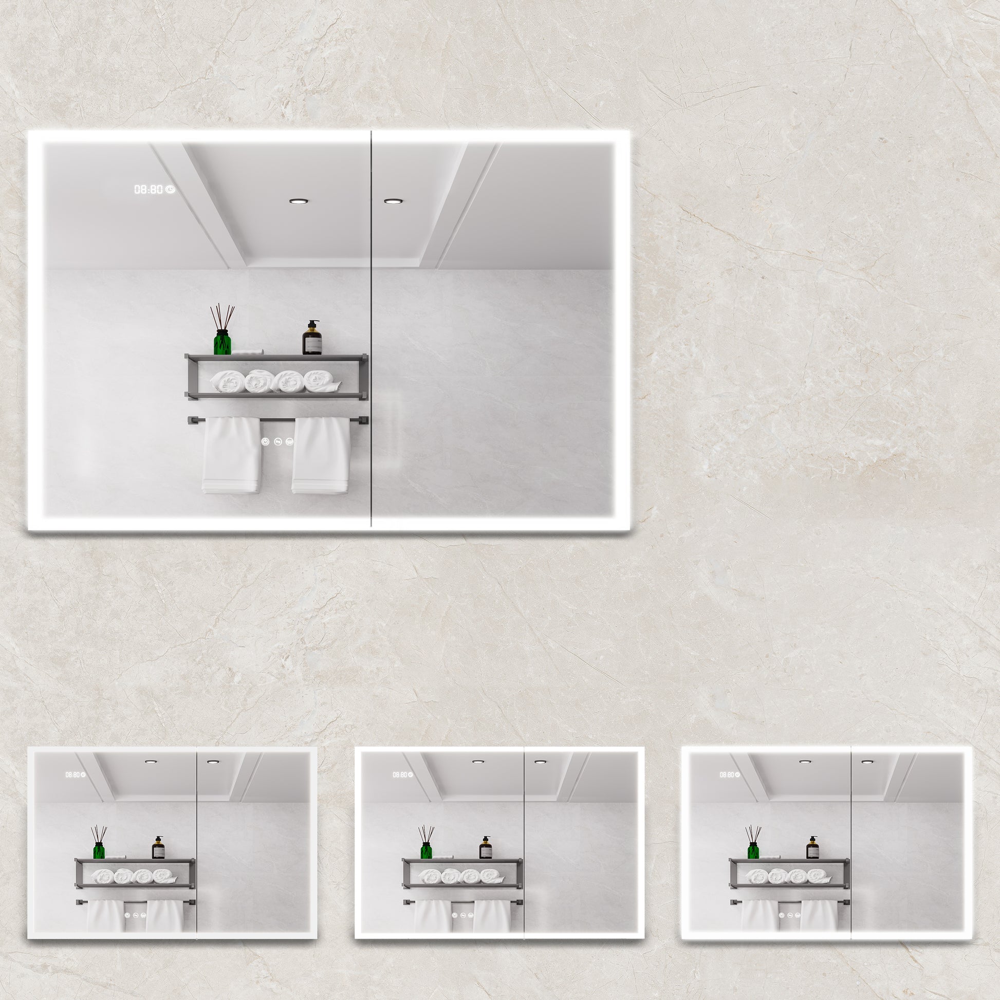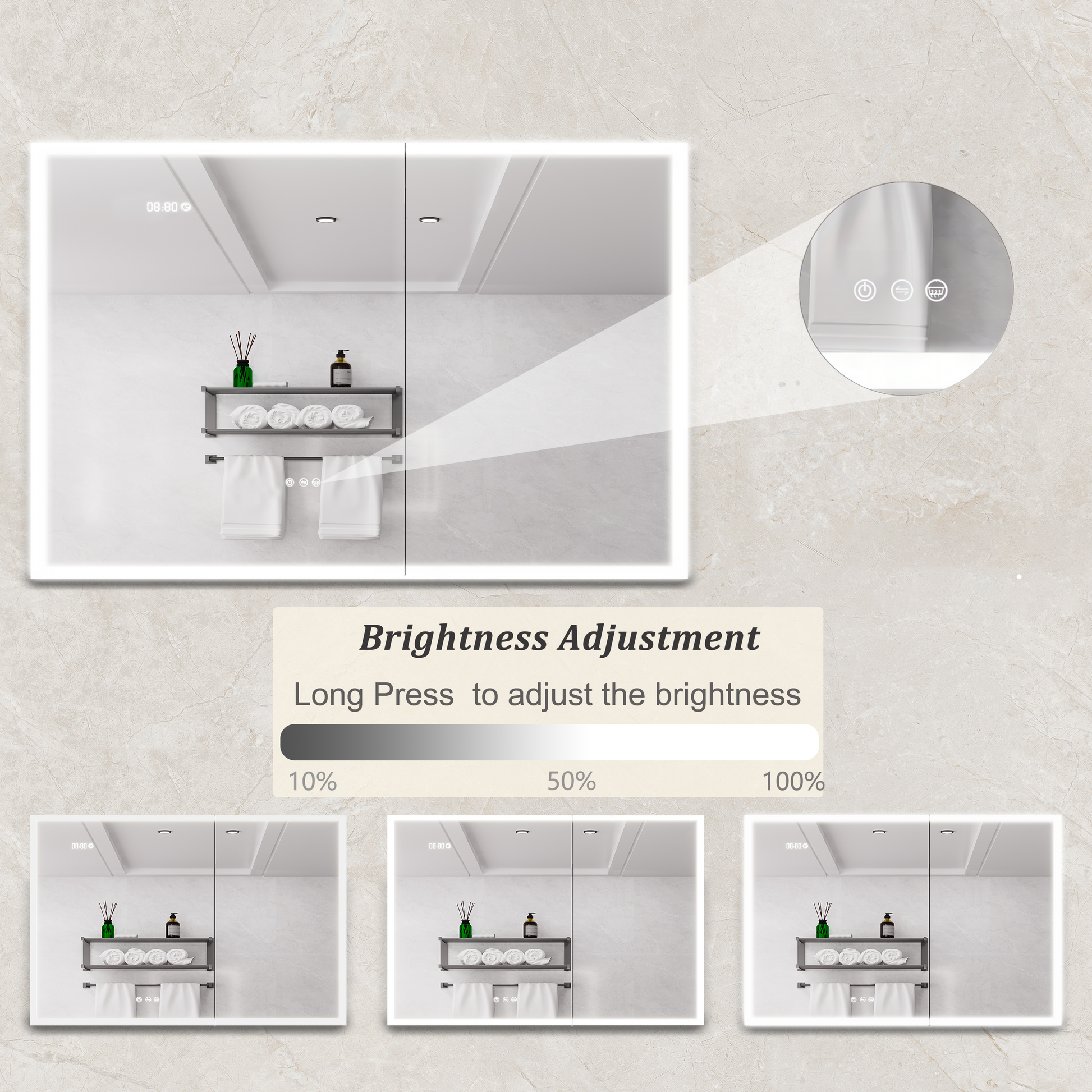 - There are three touch switches for this cabinet, which control the main light, the anti-fog function respectively, the brightness adjustment and color temperature adjustment of the lighting.