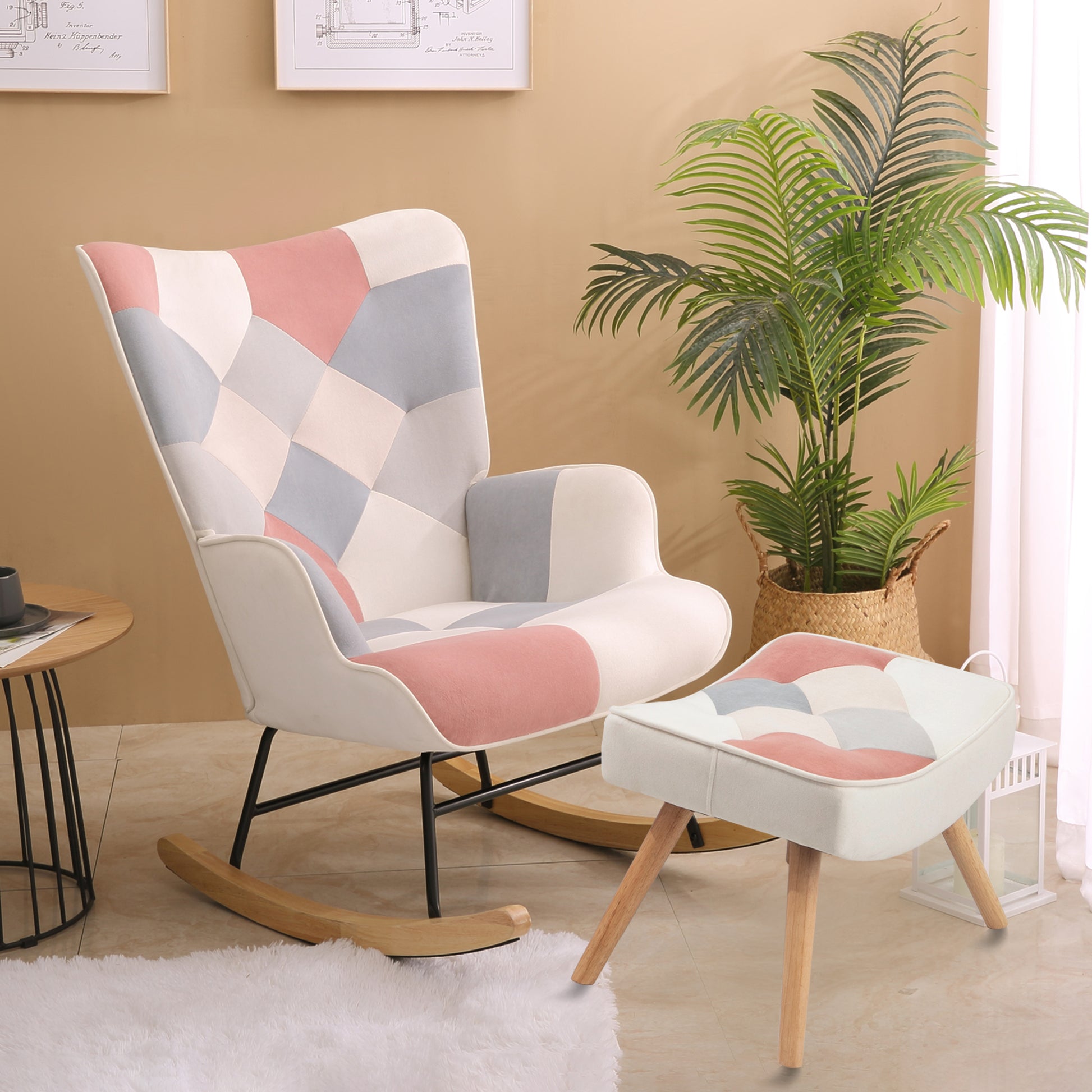 Rocking Chair with ottoman, Mid Century Fabric Rocker Chair with Wood Legs and Patchwork Linen for Livingroom Bedroom