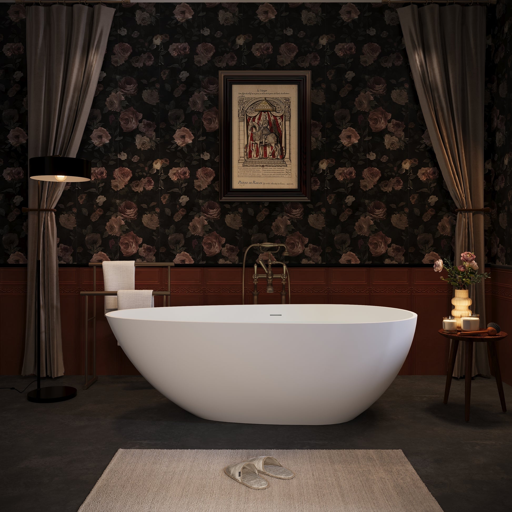 67' Freestanding Solid Surface Bathtub, Luxury Engineered Stone Resin Freestanding Soaking Bathtub with Overflow and Pop-up Drain for Contemporary Bathroom, Matte White 24S02-67MW