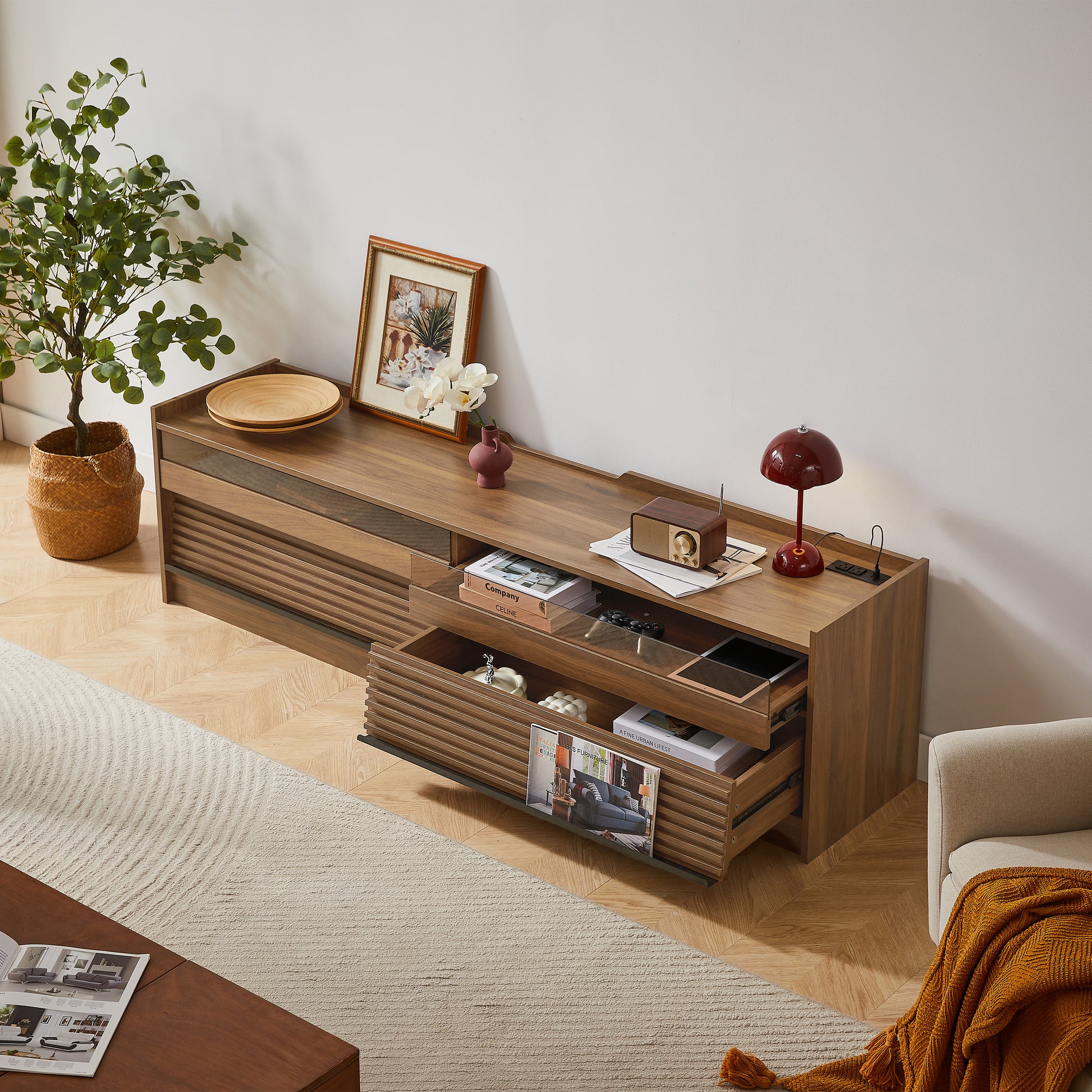 - Spacious Storage with Four Drawers:This modern TV stand features four generous drawers, providing ample storage space for all your media essentials. The drawer fronts are crafted with tempered glass and a sleek horizontal stripe design, adding a touch of elegance while maintaining a minimalist aesthetic.