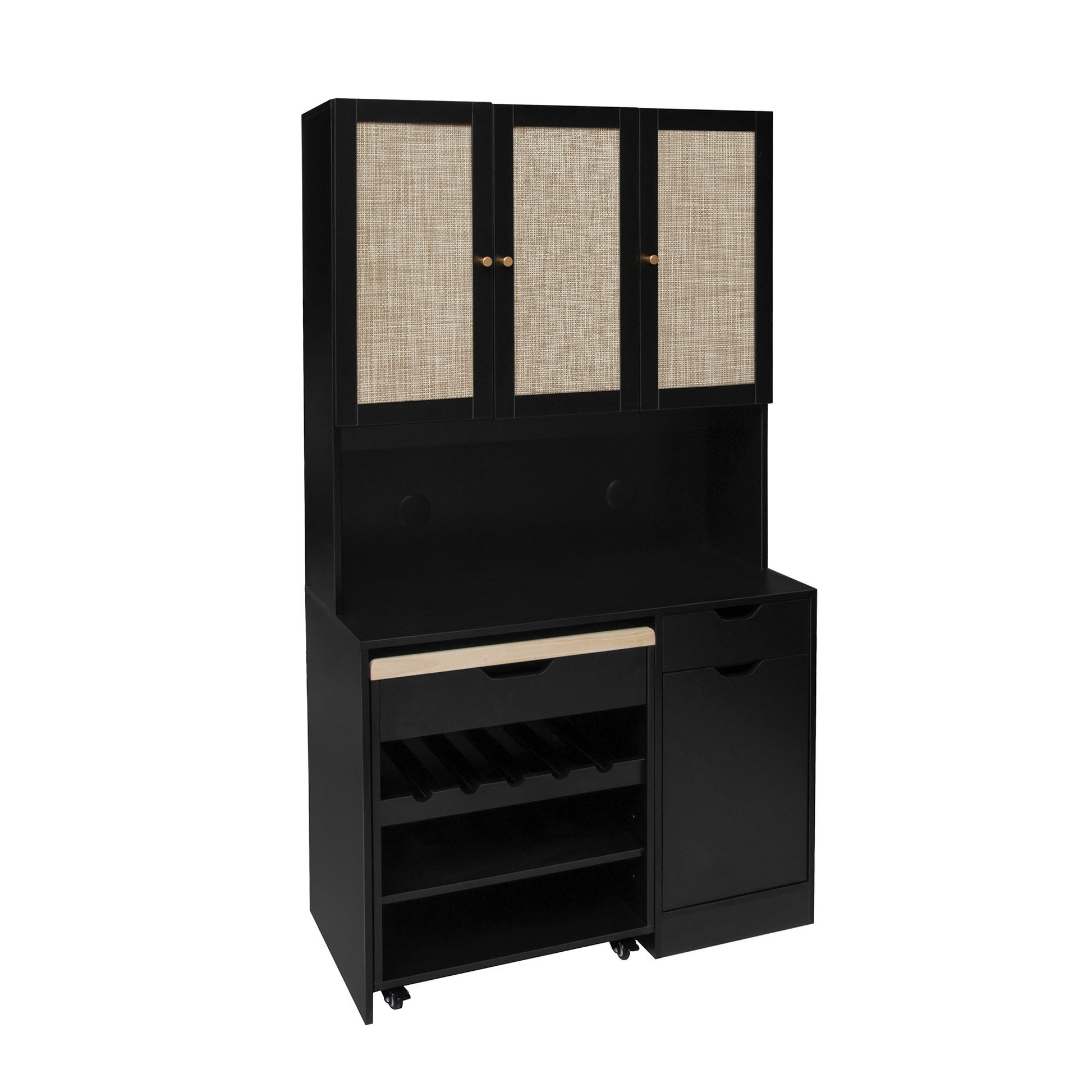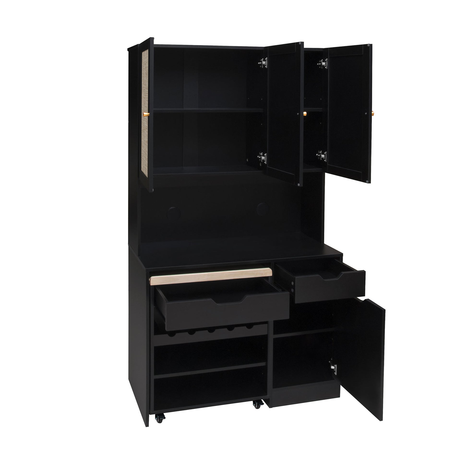 69.29' Kitchen Pantry Storage Cabinet, Modern Buffet Cabinet with Kitchen Cart, Tall Kitchen Hutch Cabinet with Microwave Stand, Food Pantry Cabinet with 3 Rattan Doors and Adjustable Shelves, Black