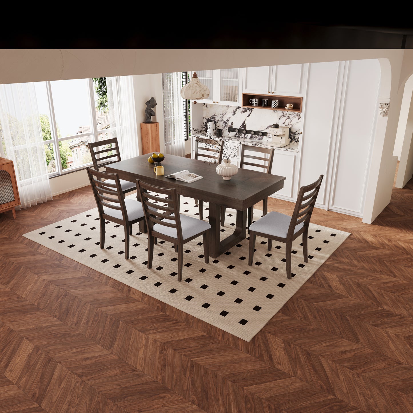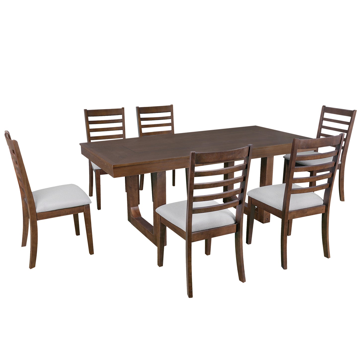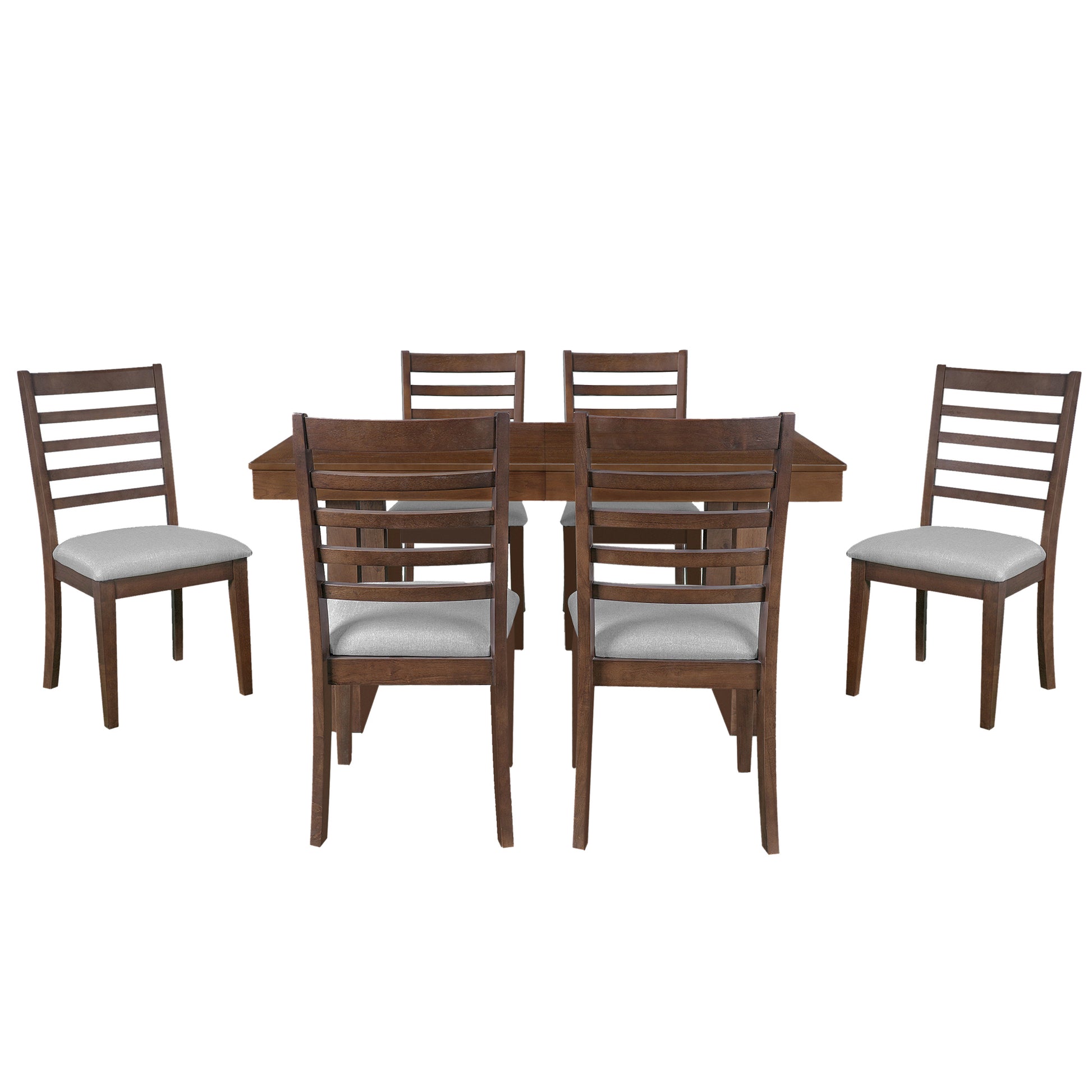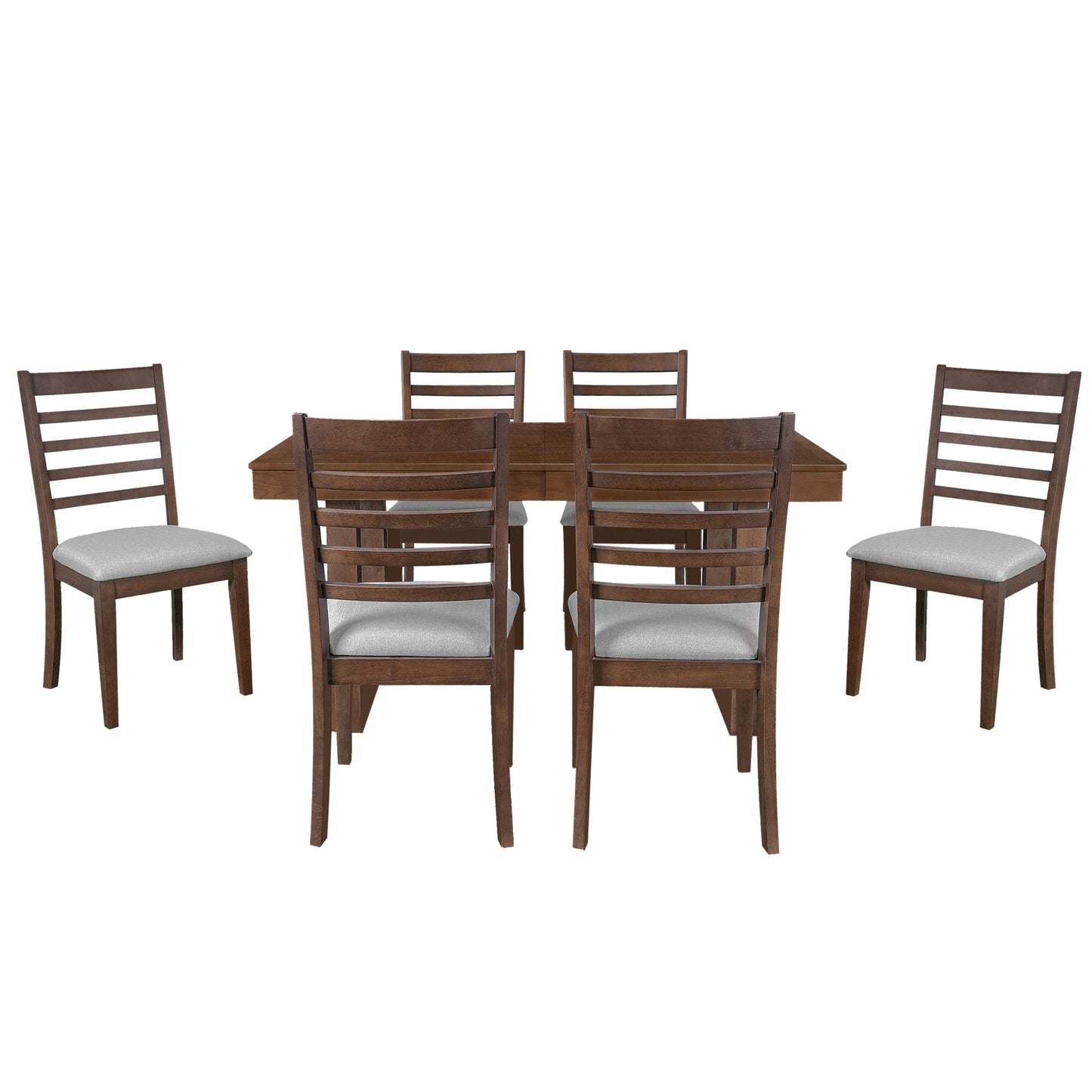 - 7 Piece Extendable Dining Table Set: This classic 6-person dining table set is designed to enhance your family dining experience. It not only blends modern and classic design elements, but also features farmhouse-style decor. The set includes an extendable wooden dining table and six upholstered dining chairs with trapezoidal backrests, adding elegance and practicality to your dining space.
