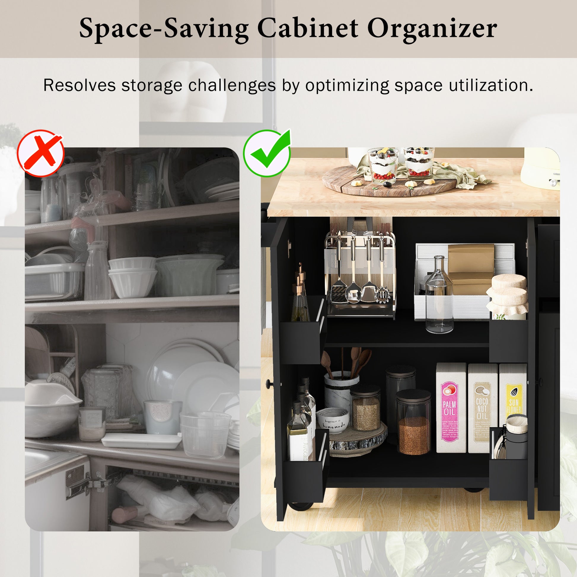 - [3-tier Pull-Out Cabinet Organizer] Our kitchen storage cart is equipped with a convenient 3-tier pull-out storage organizer. Its sleek L-shaped design, featuring a narrow top and wider second and bottom drawers, effectively solves your storage problems while maximizing the limited space. Moreover, it seamlessly blends into this large kitchen island and provides an organized home for pots, pans, and spice racks.
