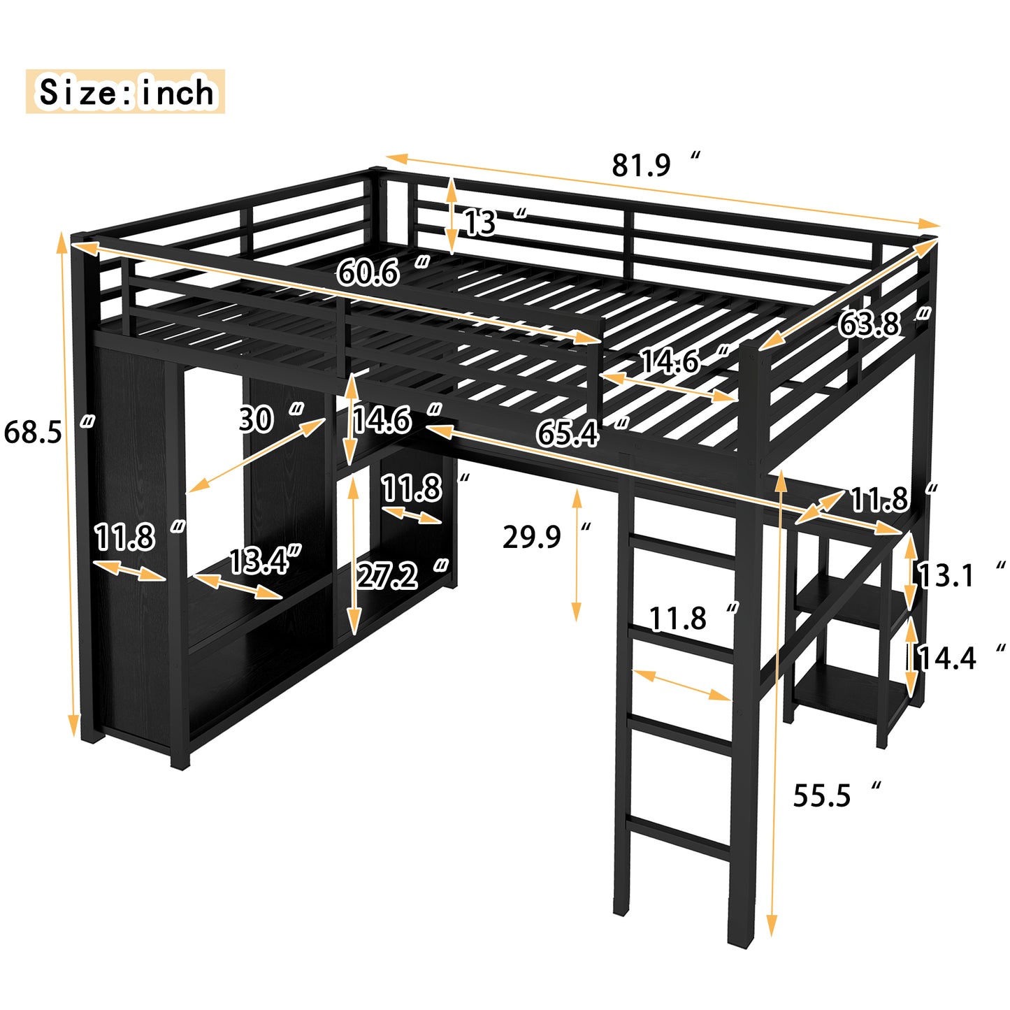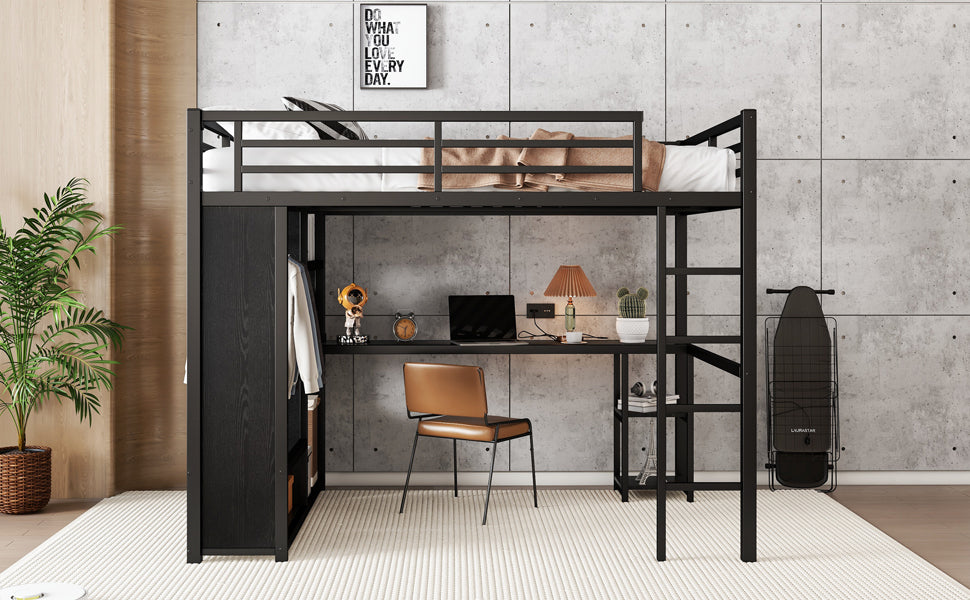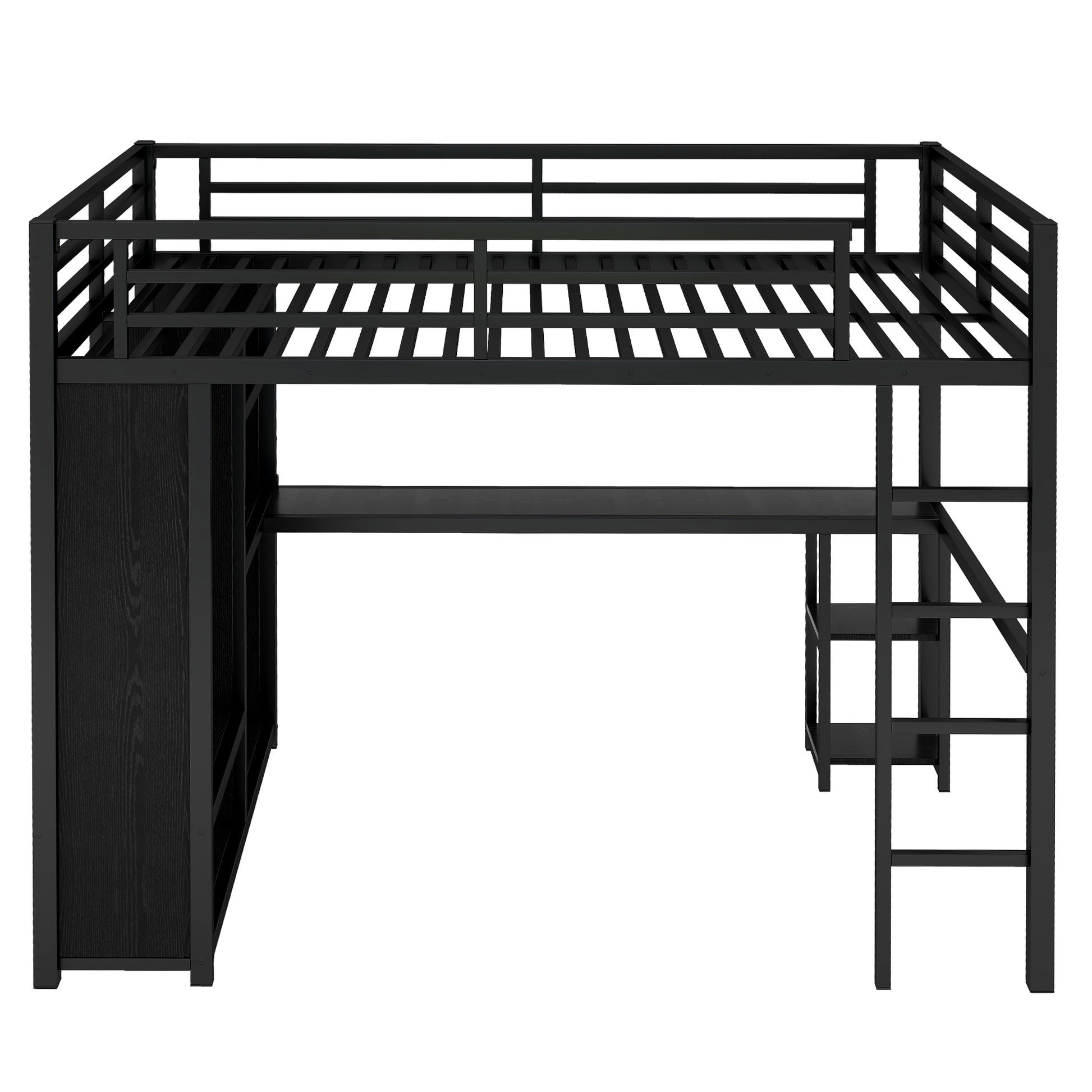 Queen Size Loft Bed Frame with Built-in Wardrobe, Metal Loft Bed with Desk and Storage Shelves, Black