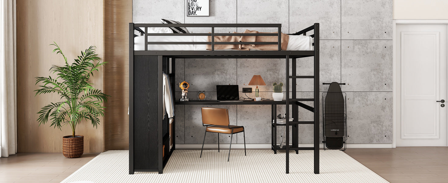 Minimal style multi-functional loft bed can make the most of your space. Crafted of metal and MDF, this loft bed strikes a simple appearance. The wardrobe underneath the bed is a practical design which offers you space to store everyday clothes. It will definitely save plenty of space for you. And the metal loft bed comes with several shelves to lay out home items for you. Plus, equipped with a desk underneath, this bed definitely offers you a comfortable place to work, read and enjoy yourself. Upgrade your bedroom with our metal frame loft bed and enjoy a blend of modern functionality and classic charm.