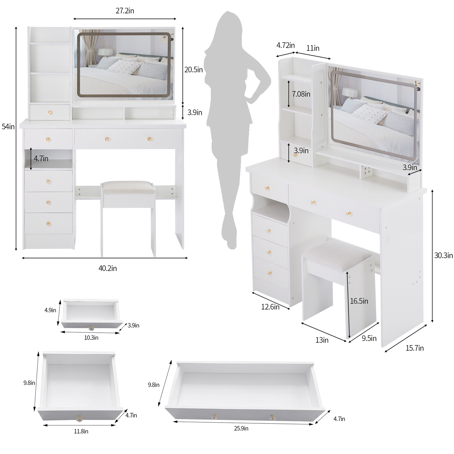 - [41' length, equipped with a 27'x20' vanity mirror]: The length of the vanity table is 41', the width is 15.7', and the height is 54', equipped with a 27'x20' vanity mirror. It has a very large countertop and ultra-high storage capacity, suitable for adult use. It requires a lot of space.