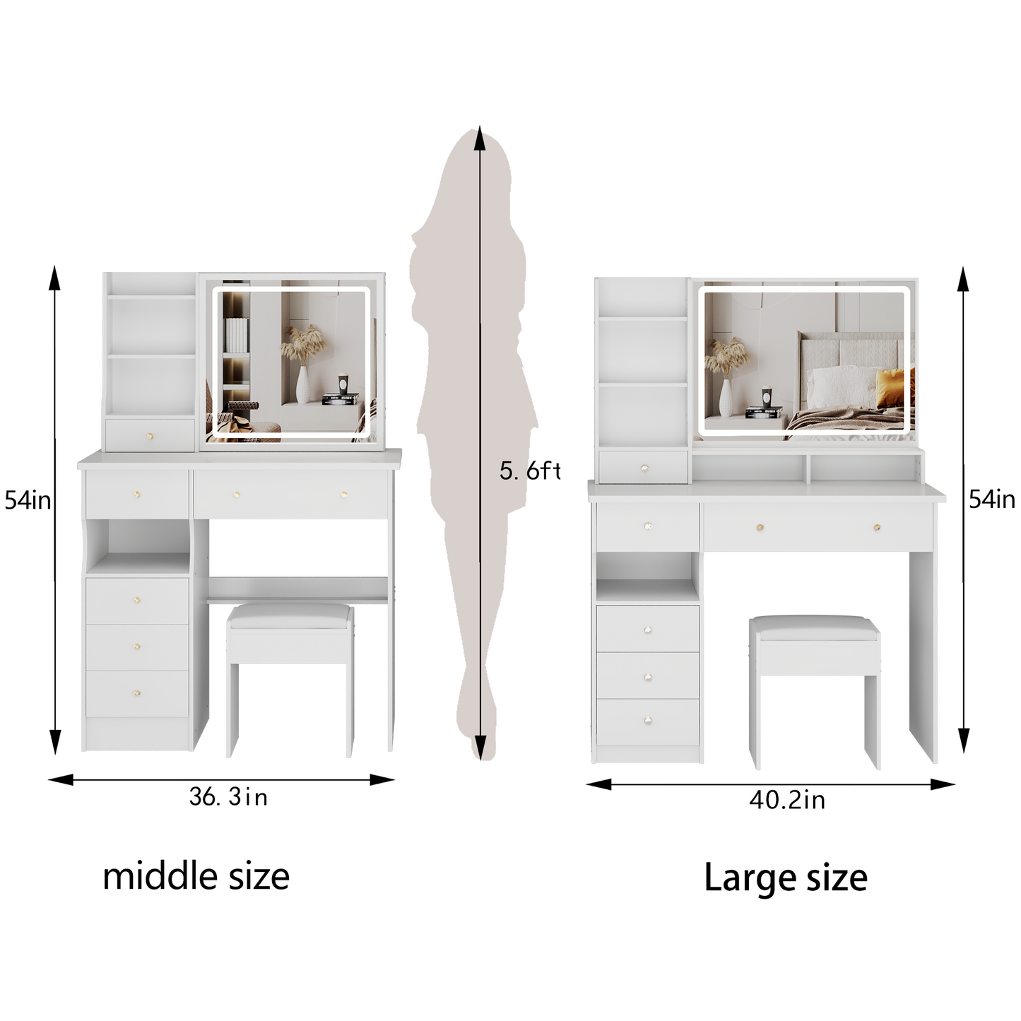 - [Configuration]: This dressing table is a basic version, including a mirror light, not include built-in socket or hair dryer stand. Due to the same installation steps for the same product with simple, basic, and luxurious configurations, the installation manual is in a universal form.