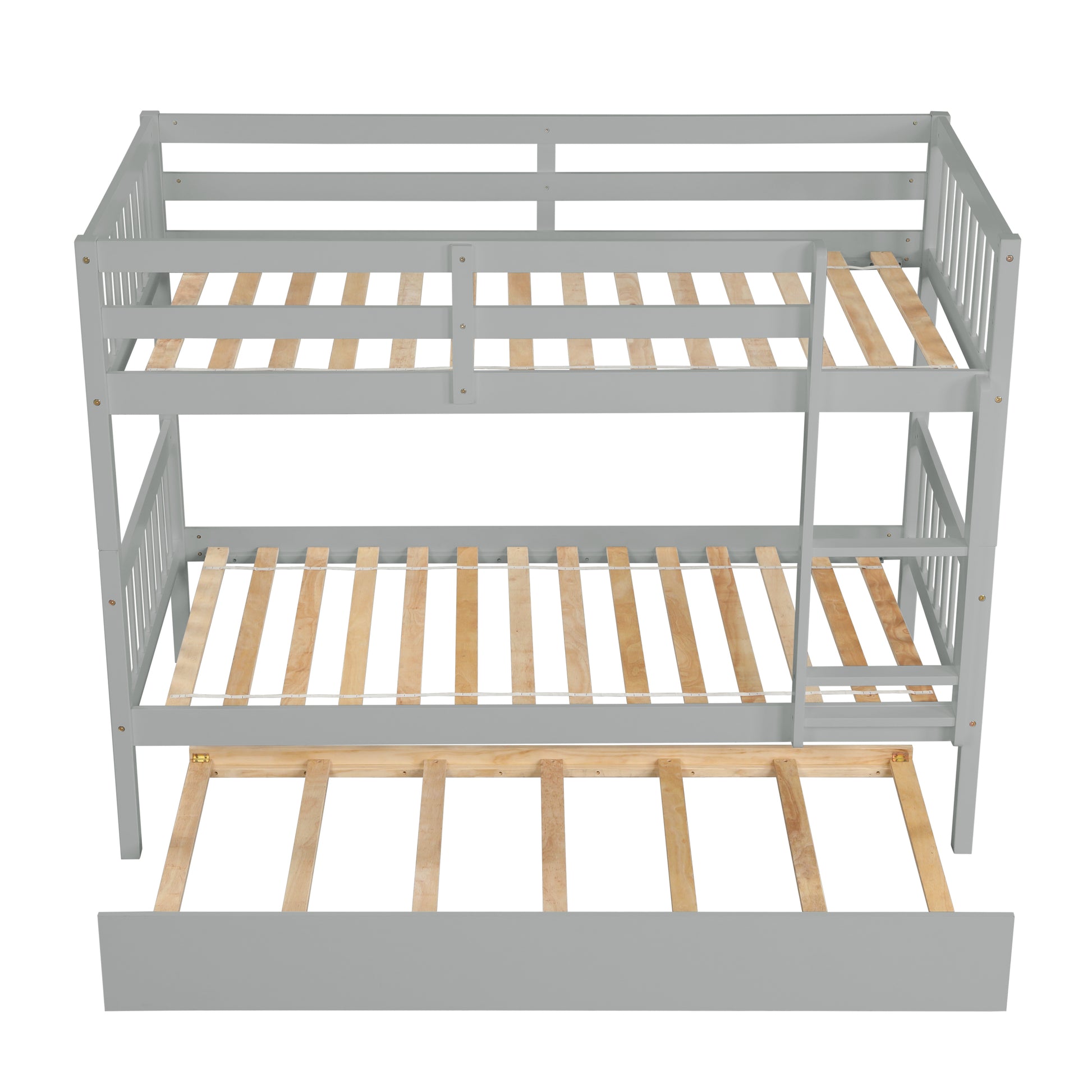 Twin Over Twin Rubber Wood Bunk Bed with Trundle, Convertible into Twin Size Beds, Twin Size Bunk Bed with Ladder and Safety Guardrails,Grey