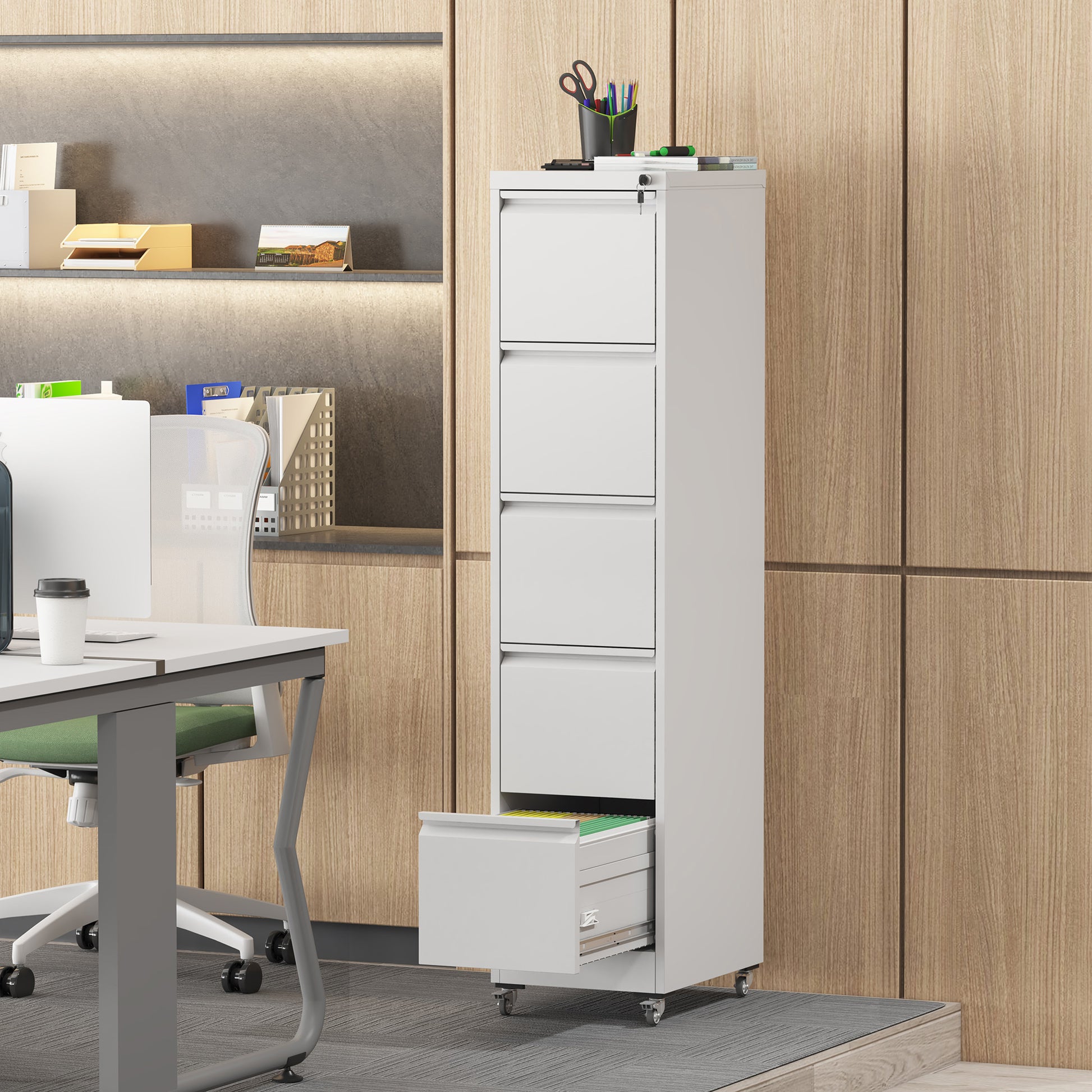 Transform your office organization with our 5 - drawer vertical file cabinet on wheels! This versatile storage solution is perfect for both home and office environments, offering ample space for A4, legal, and letter - sized documents. The cabinet features 4 lockable wheels, allowing for easy mobility while ensuring stability when needed. The wheels can also be removed if preferred. With its high - capacity design and anti - tilt mechanism, this file cabinet provides both convenience and safety. Made from durable all - steel construction with a smooth, waterproof coating, it's built to last and easy to maintain. Assembly is simple, and our team is always ready to assist with any installation questions.