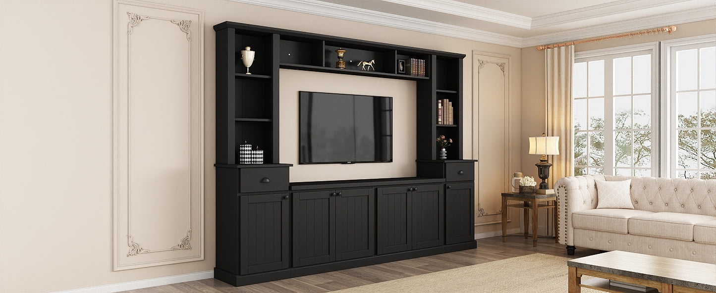 This large TV stand set features clean and modern lines that create an elegant and contemporary aesthetic. The addition of black handles and vertical stripe design on the door panels add a refined feeling, enhancing the overall visual appeal.