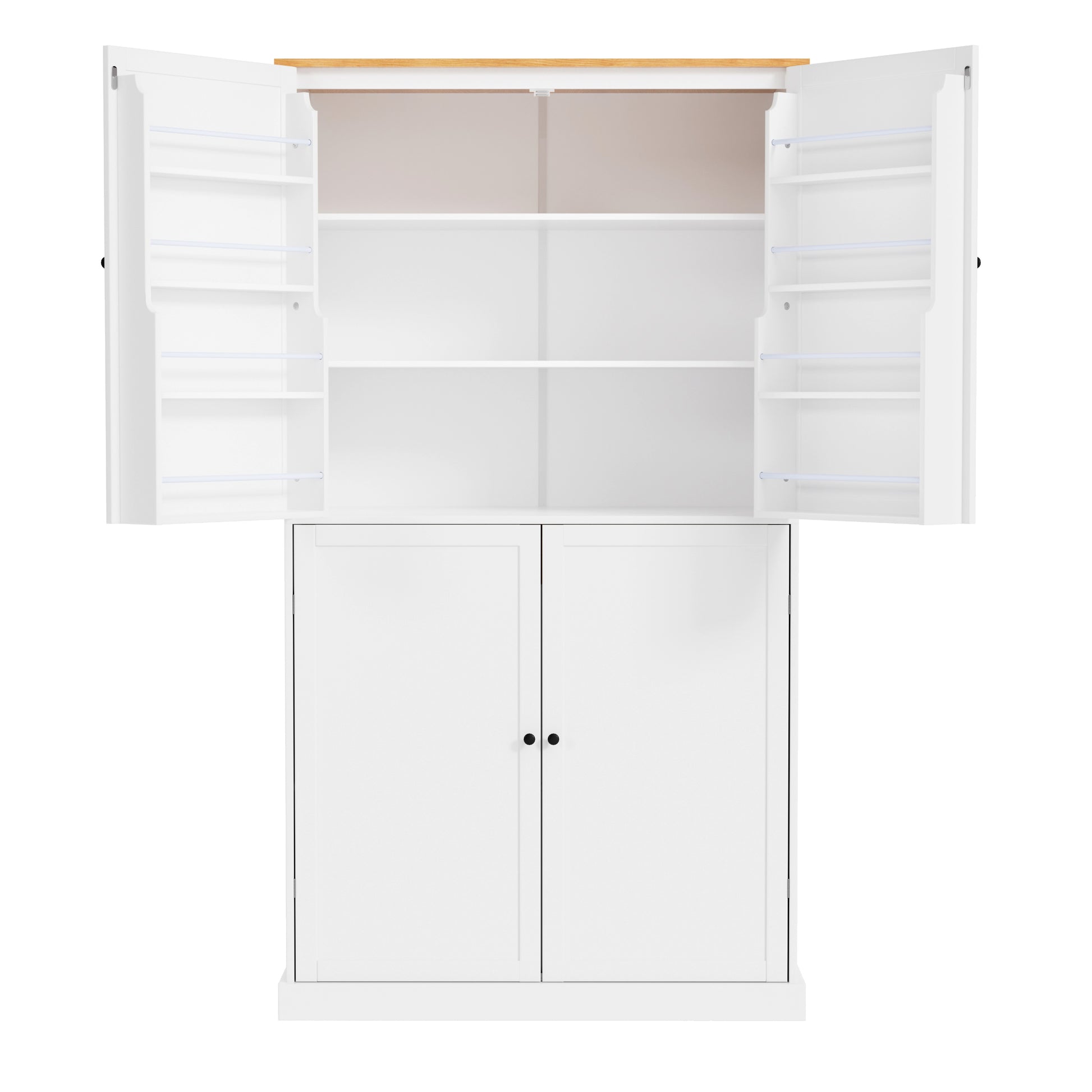 - [8 Door Storage Shelves]This elegantly designed 4 doors kitchen pantry includes two upper doors, each opening to reveal 4 door shelves that cleverly maximize storage space. The shelves are thoughtfully varied in height(from 5.9” to 8.7”), making it easy to store items ranging from tall bottles to small jars. For added convenience and safety, removable barriers are installed to ensure nothing slips out accidentally.
